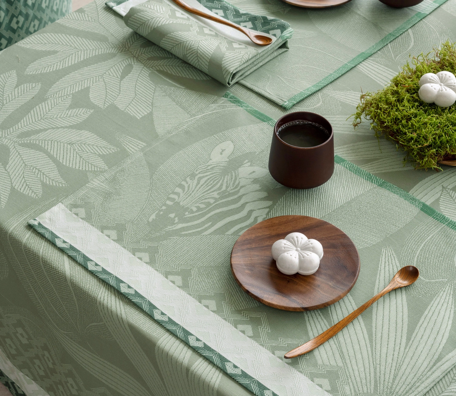 Kolekcja Nature Sauvage to odpowiedź na tęsknotę za naturą i autentycznością. Obrus z tej serii zdobi delikatny, tonalny motyw roślinny, który został misternie utkany przy użyciu techniki żakardowej. Precyzyjny splot oddaje piękno różnorodnych liści z niezwykłą szczegółowością, tworząc ciepły, organiczny klimat przy stole.
