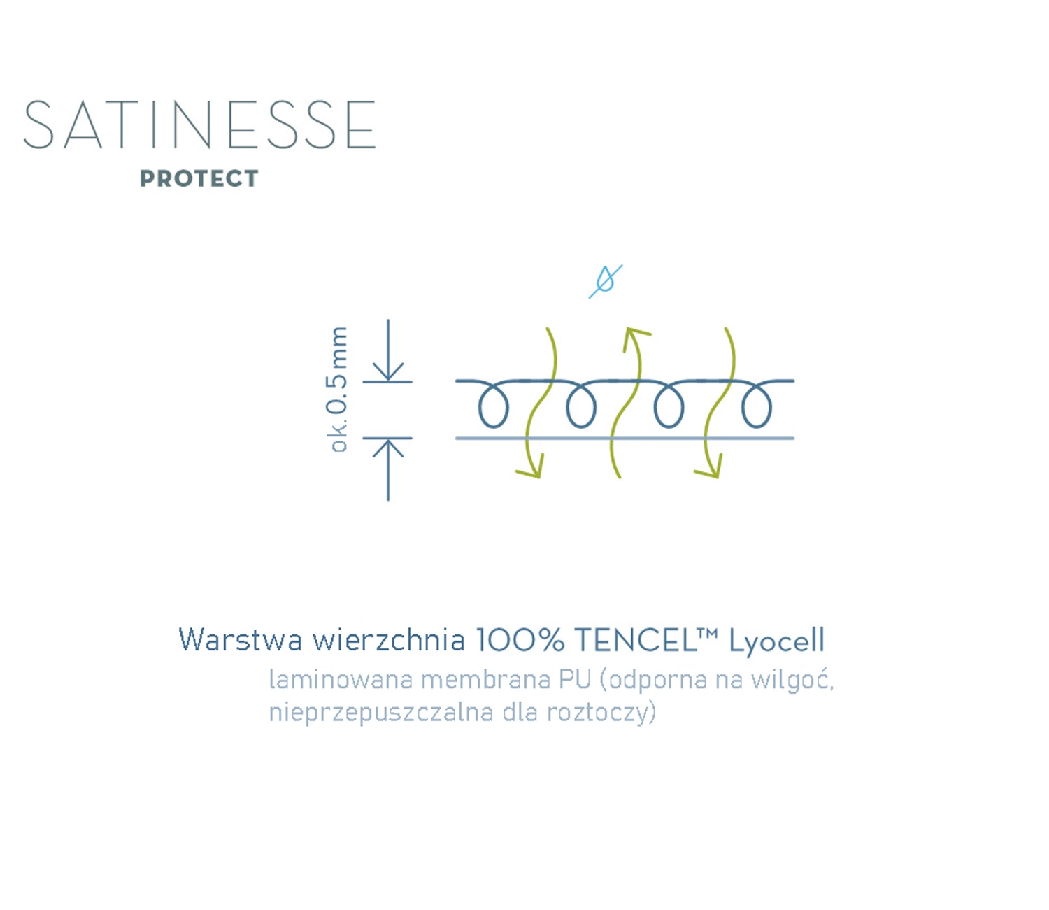 Wierzchnia warstwa ochraniacza została wykonana ze 100% TENCEL™ Lyocell, włókna znanego ze swojej niezwykłej miękkości i zdolności do odprowadzania wilgoci. Spodnia membrana PU jest rozciągliwa, oddychająca i odporna na wilgoć – chroni materac przed plamami i nieprzyjemnymi zapachami, a jednocześnie nie zakłóca naturalnej cyrkulacji powietrza. Dzięki temu Satinesse Protect zapewnia świeżość, komfort i zdrowe warunki do regenerującego snu każdej nocy.