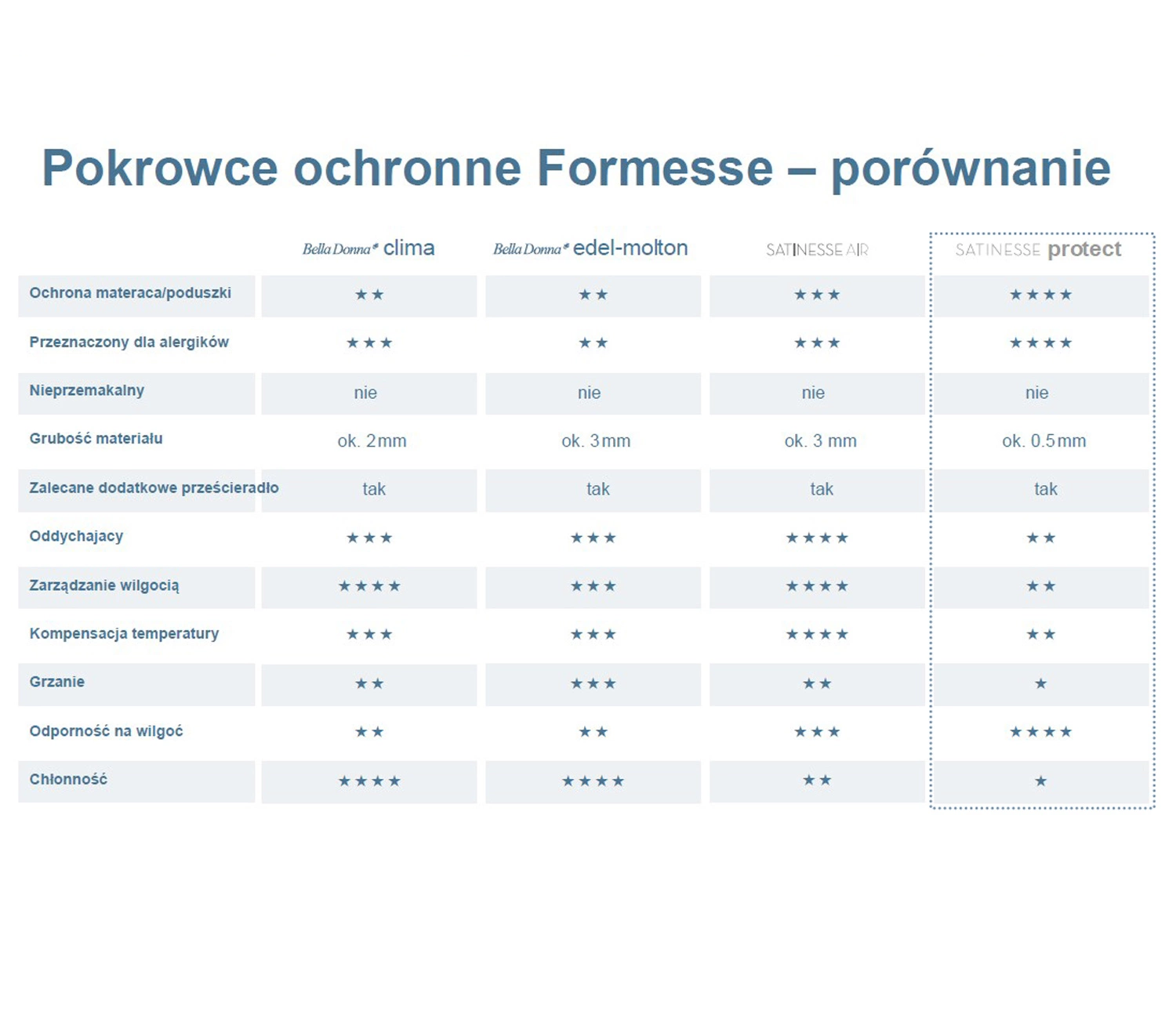 - Formesse Satinesse Protect to luksusowy ochraniacz na materac standardowy do 30 cm stworzony z myślą o alergikach. Dzięki oddychającej membranie PU świetnie chroni przed roztoczami, wilgocią i brudem, zapewniając higieniczne i komfortowe środowisko snu.