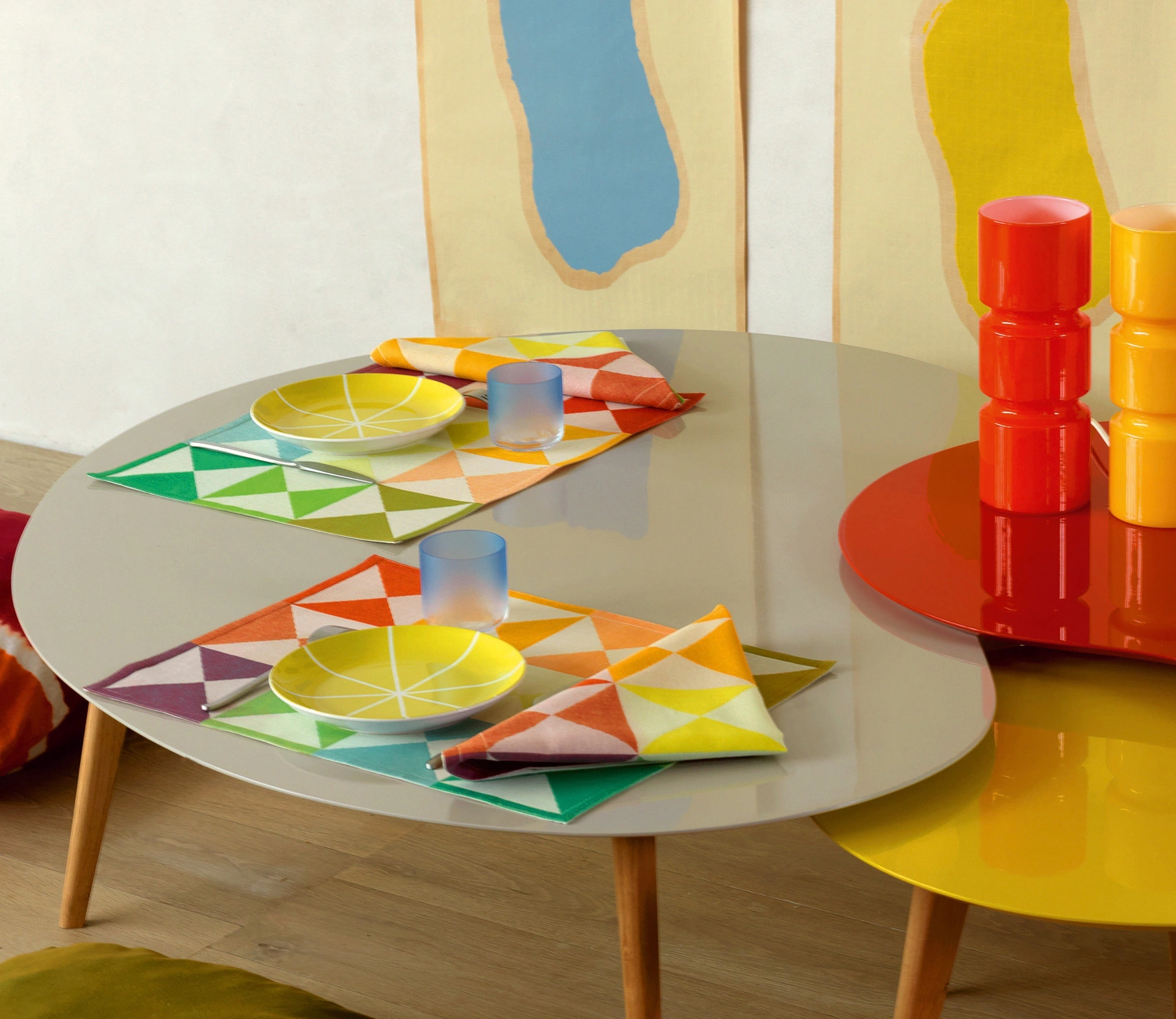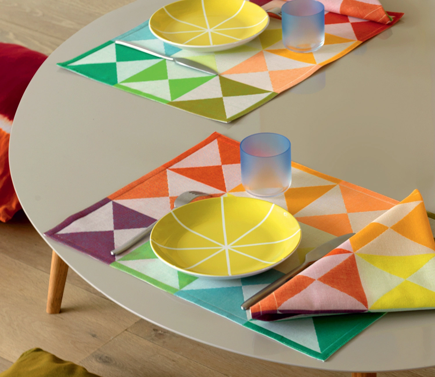 Dwustronne podkładki na stół Origami o nowoczesnym, graficznym wzorze w żywych kolorach.