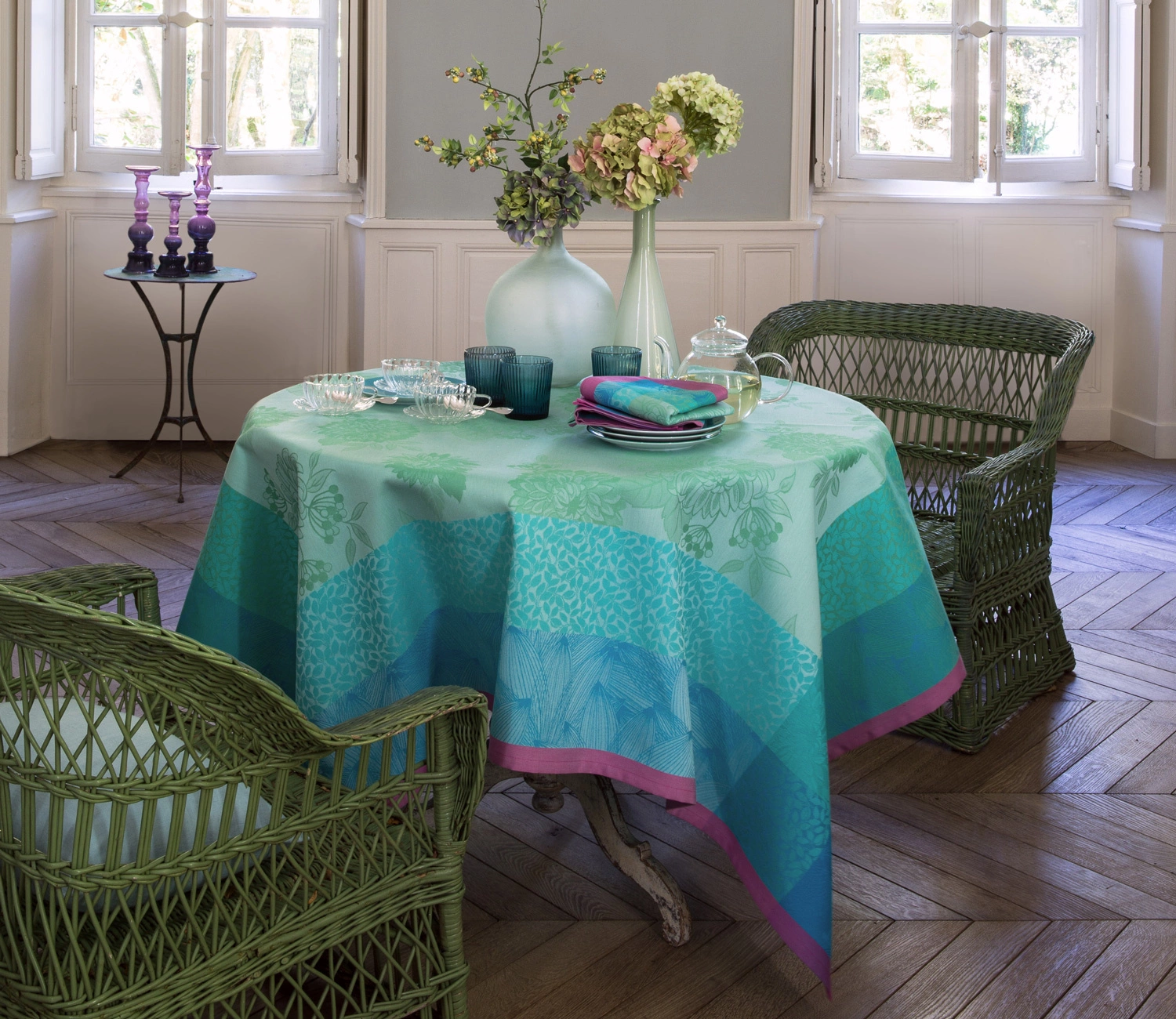 Obrus Parfums De Bagatelle - motyw inspirowany świeżymi daliami wprowadza lekko romantyczny akcent do wnętrza. Tkanina wykonana ze 100% czesanej bawełny o długich włóknach i gramaturze 205 g/m² – miękka w dotyku, odporna na ścieranie i intensywne użytkowanie.