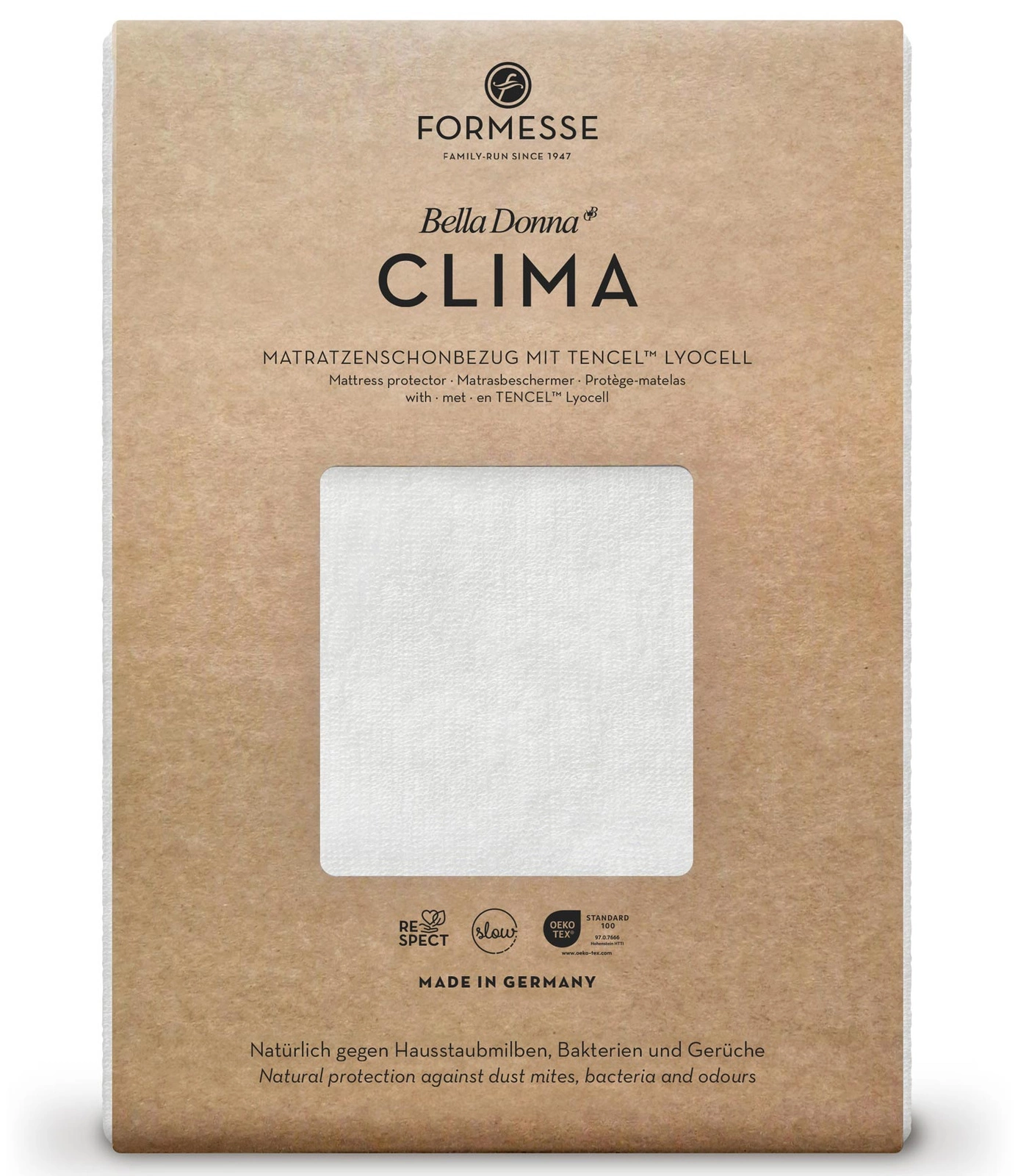 - Formesse Bella Donna Clima to luksusowy ochraniacz na materac do 30 cm z powierzchnią frotte z TENCEL™ Lyocell. Zapewnia wyjątkową chłonność, skuteczne zarządzanie wilgocią i optymalną regulację temperatury dla zdrowego, suchego i higienicznego snu.