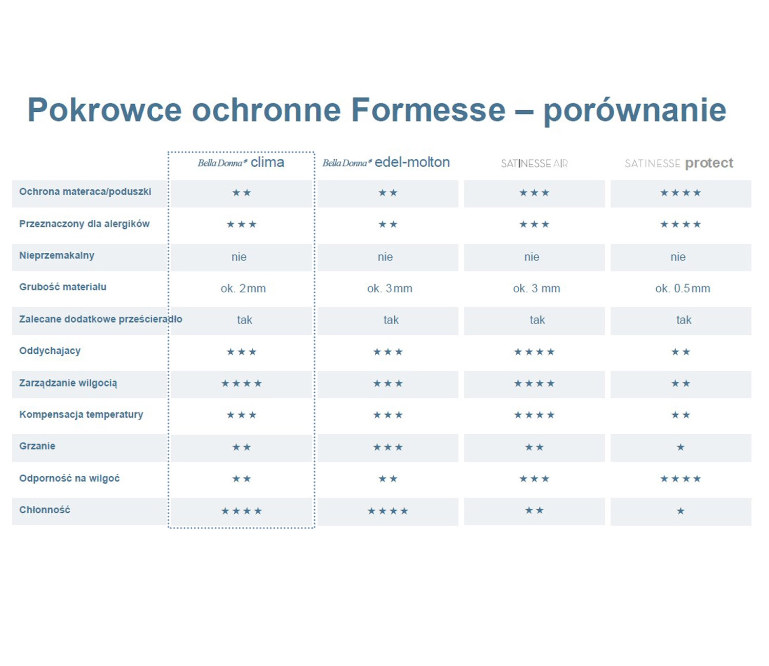• Formesse Bella Donna Clima to luksusowy ochraniacz na wysoki materac do 45cm z powierzchnią frotte z TENCEL™ Lyocell. Zapewnia wyjątkową chłonność, skuteczne zarządzanie wilgocią i optymalną regulację temperatury dla zdrowego, suchego i higienicznego snu.