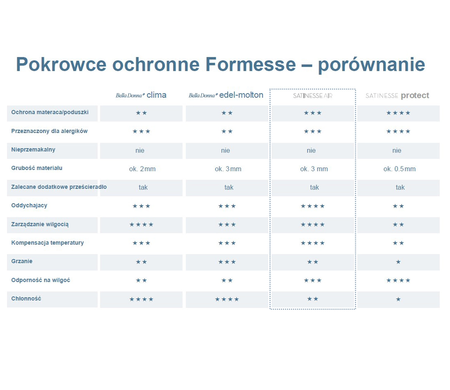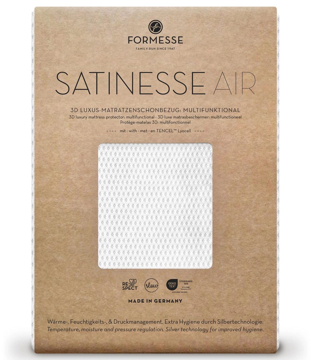 - Formesse Satinesse Air to luksusowy ochraniacz na materac do 30 cm z trójwymiarową tkaniną 3D. Zapewnia cyrkulację powietrza, regulację temperatury i ochronę z jonami srebra dla idealnie higienicznego snu.