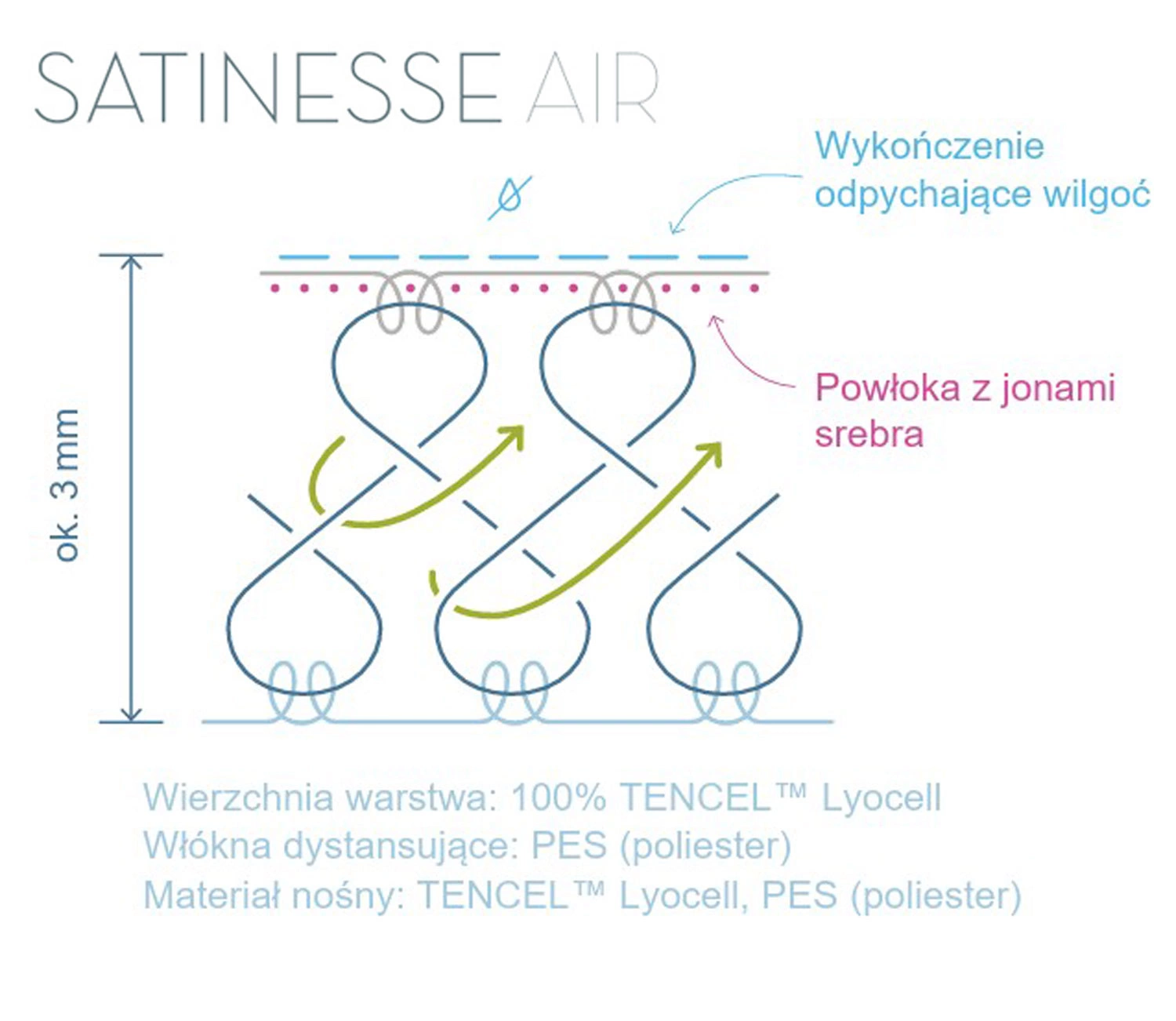 Satinesse Air został dodatkowo wzbogacony o powłokę z jonami srebra, która działa antybakteryjnie i chroni przed rozwojem nieprzyjemnych zapachów. To sprawia, że środowisko snu pozostaje świeże i higieniczne na dłużej – idealne rozwiązanie dla alergików i osób dbających o zdrowie.