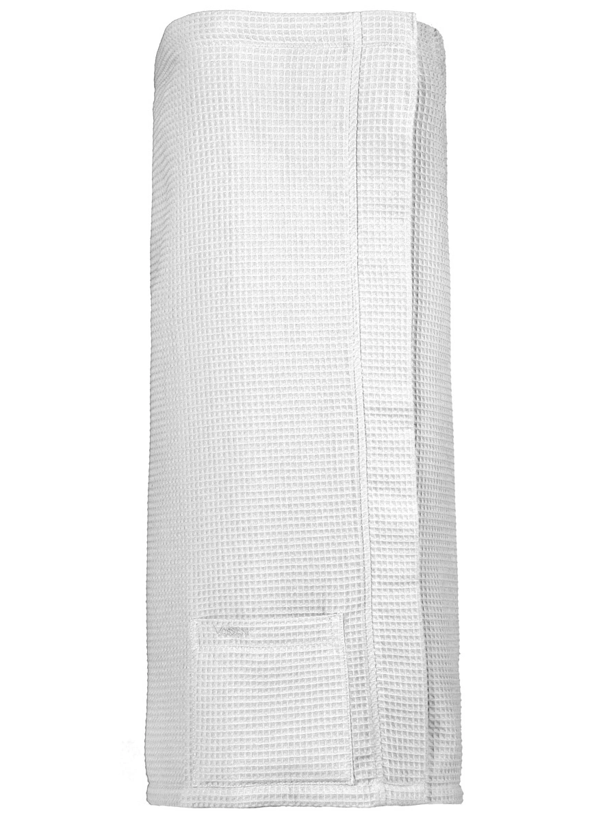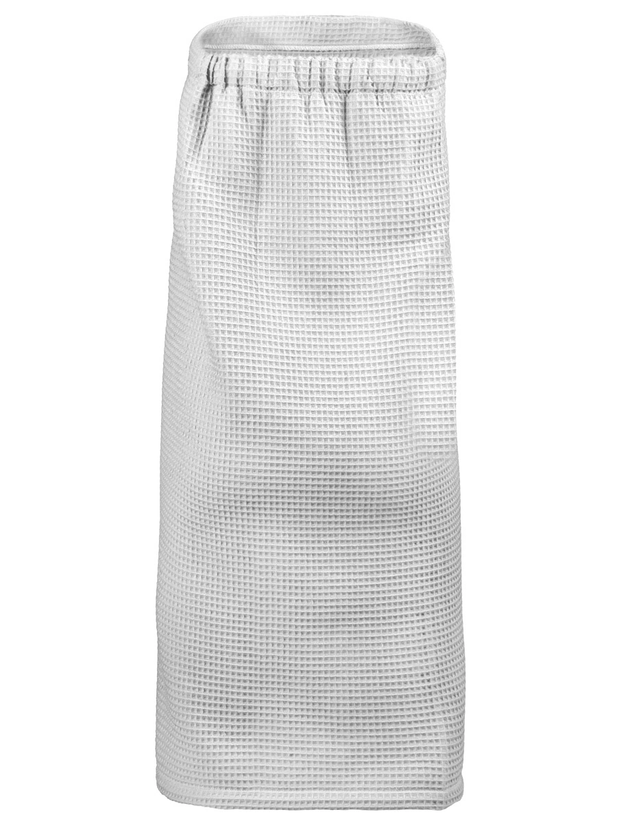 Cienka i lekka damska spódnica do sauny Well w kolorze białym. Gofrowana struktura zapewnia idealną absorpcję wilgoci, u dołu spódnicy wygodna kieszonka z wyhaftowanym logiem producenta. Regulowana w biuście za pomocą 4 napów
