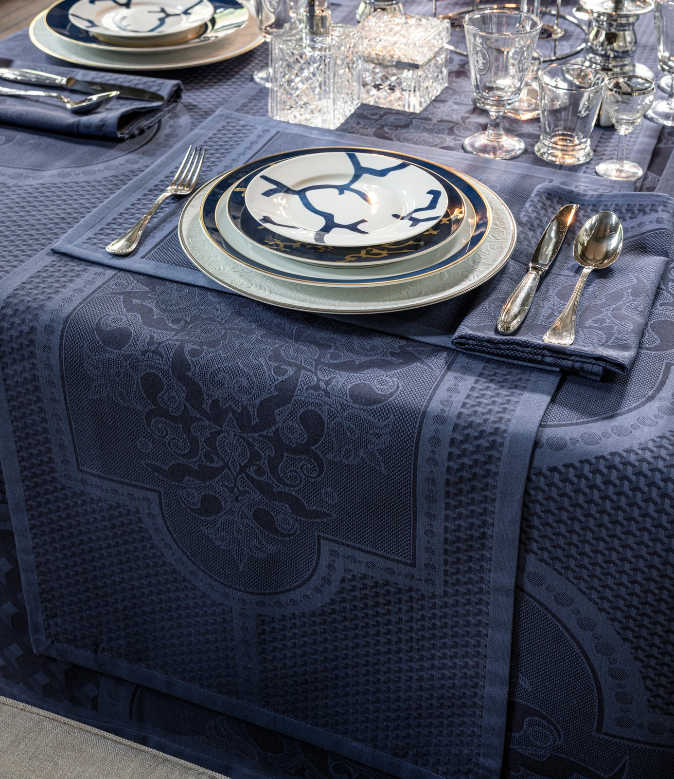 - Bieżnik Palais Vénitien Adriatique – elegancja inspirowana pałacami Wenecji. Barokowe i geometryczne wzory, czesana bawełna i staranne wykończenie. Jakość i bezpieczeństwo potwierdzone certyfikatem OEKO-TEX® STANDARD 100. Kolor granatowy.