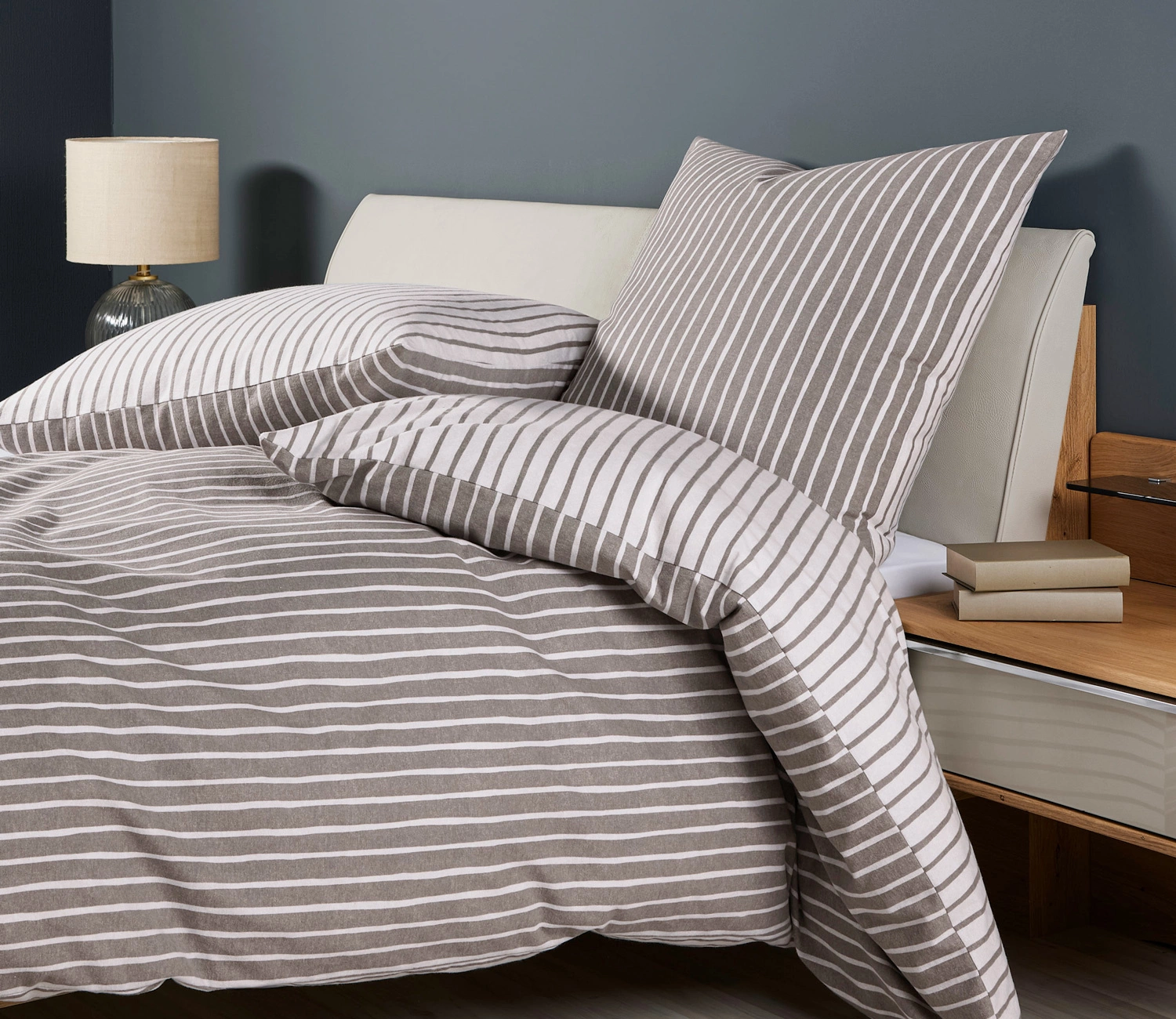 - Pościel flanelowa dwustronna Davos 65170-07 marki Janine. Z jednej strony posiada wzór w białe paski, z drugiej strony pasy w kolorze beżowym. Wykonana z miękkiej i przytulnej tkaniny która jest przyjemnie ciepła i reguluje temperaturę.