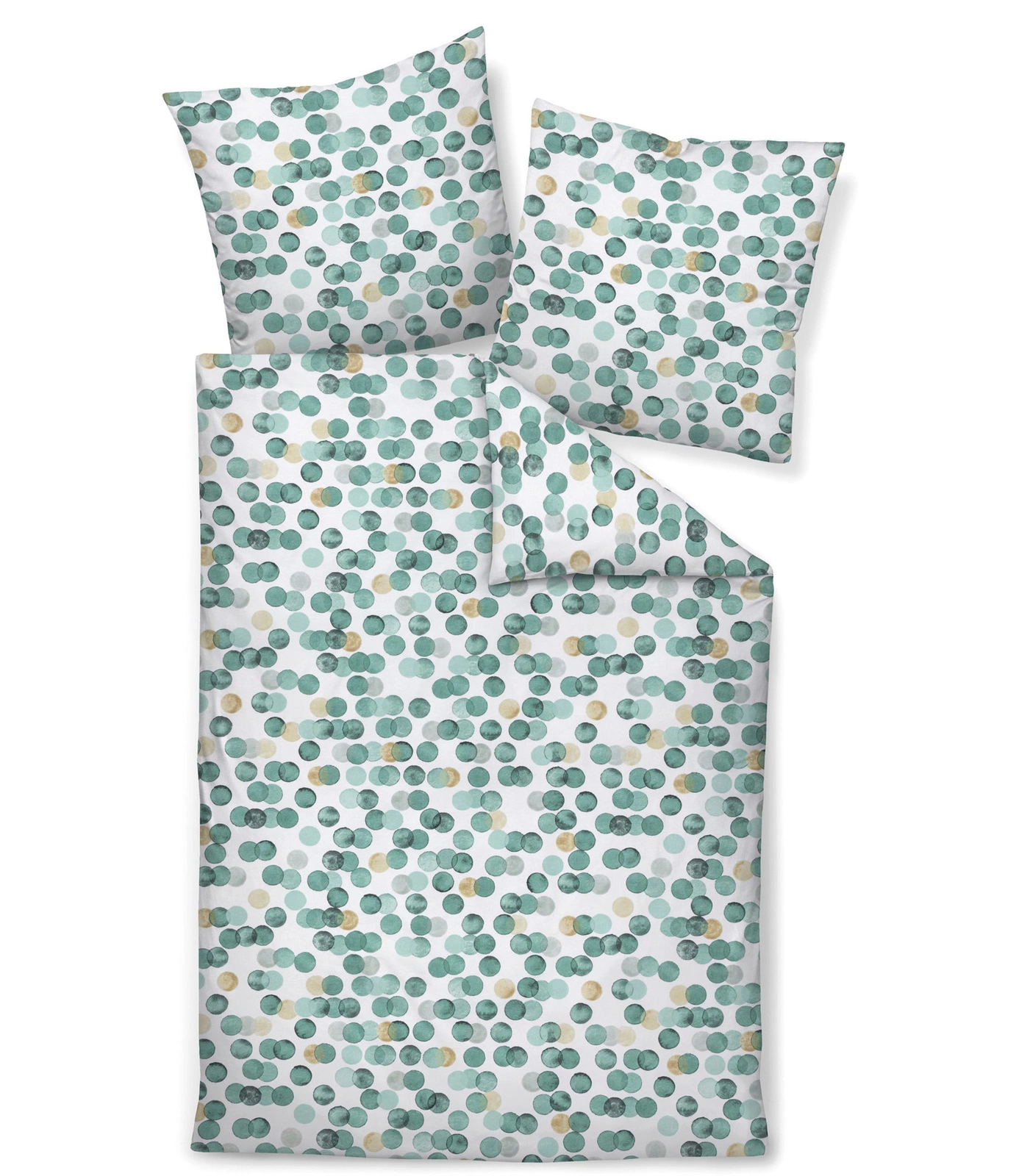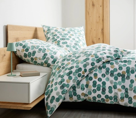 Pościel flanelowa Davos 65176-06 marki Janine. Nowoczesny wzór w liczne zielone kółka, które wyglądają jak namalowane akwarelą. Tło białe. Wykonana z wysokiej jakości flaneli, ze 100% bawełny - miękkiej i przytulnej, która jest przyjemnie ciepła i reguluje temperaturę. Idealna na jesienno-zimową porę roku. Łatwa w pielęgnacji, zapinana na zamek błyskawiczny.