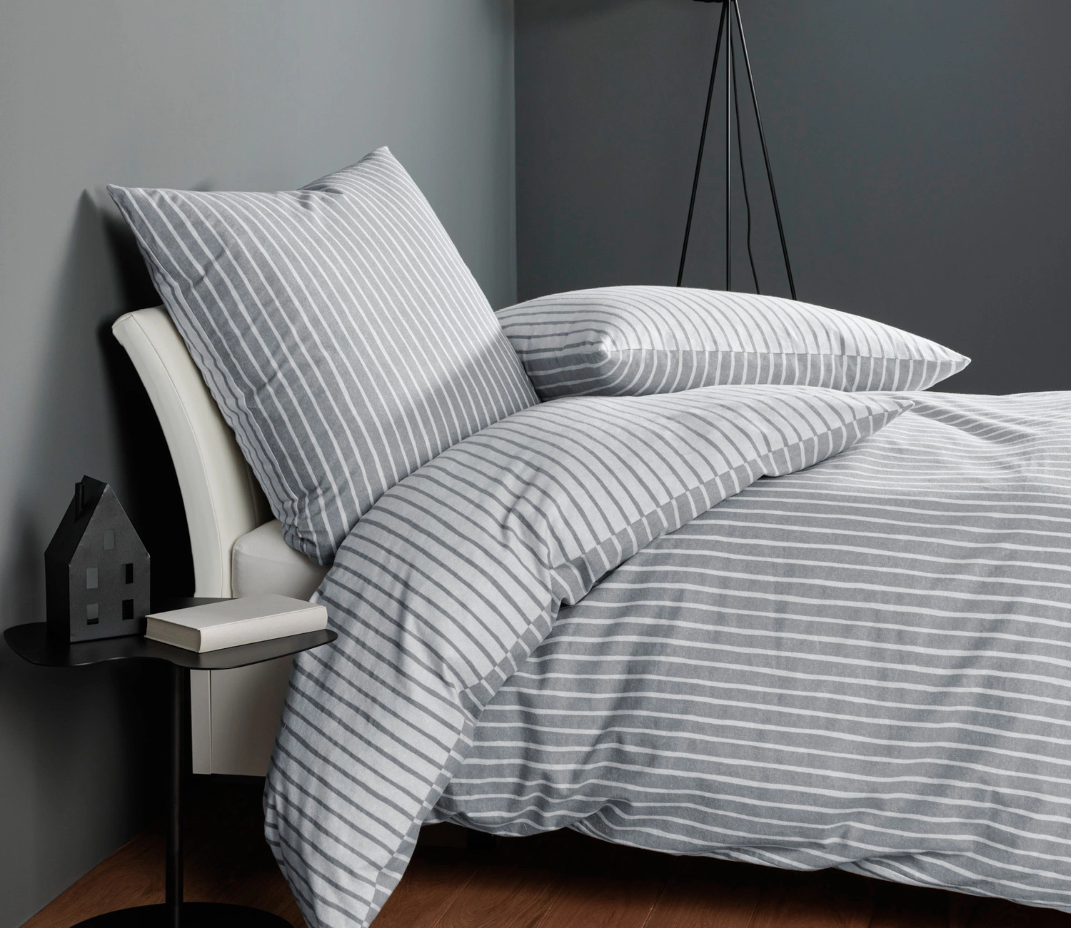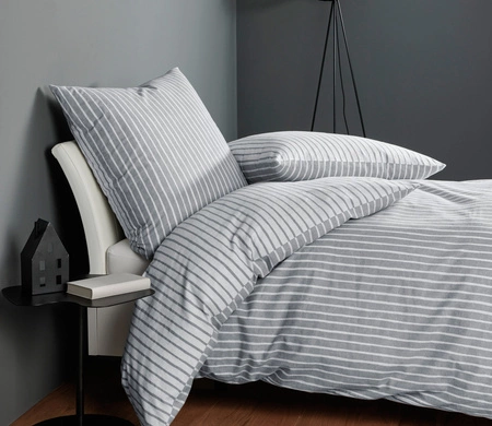 Pościel flanelowa dwustronna Davos 65170-08 marki Janine. Z jednej strony posiada wzór w białe paski, z drugiej strony pasy w kolorze szarym. Wykonana z wysokiej jakości flaneli, ze 100% bawełny - miękkiej i przytulnej, która jest przyjemnie ciepła i reguluje temperaturę. Idealna na jesienno-zimową porę roku. Łatwa w pielęgnacji, zapinana na zamek błyskawiczny.