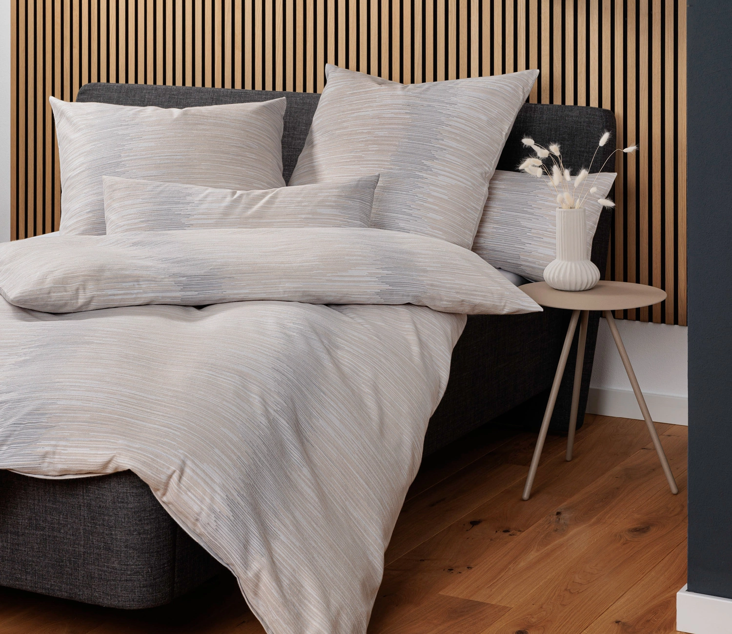 Pościel flanelowa Chinchilla S 78067-08 marki Janine. Nowoczesny wzór w poprzeczne cieniowane prążki w odcieniach beżowo - szarych. Wykonana z wysokiej jakości flaneli, ze 100% bawełny - miękkiej i przytulnej, która jest przyjemnie ciepła i reguluje temperaturę. Idealna na jesienno-zimową porę roku. Łatwa w pielęgnacji, zapinana na zamek błyskawiczny. Nie wymaga prasowania.
