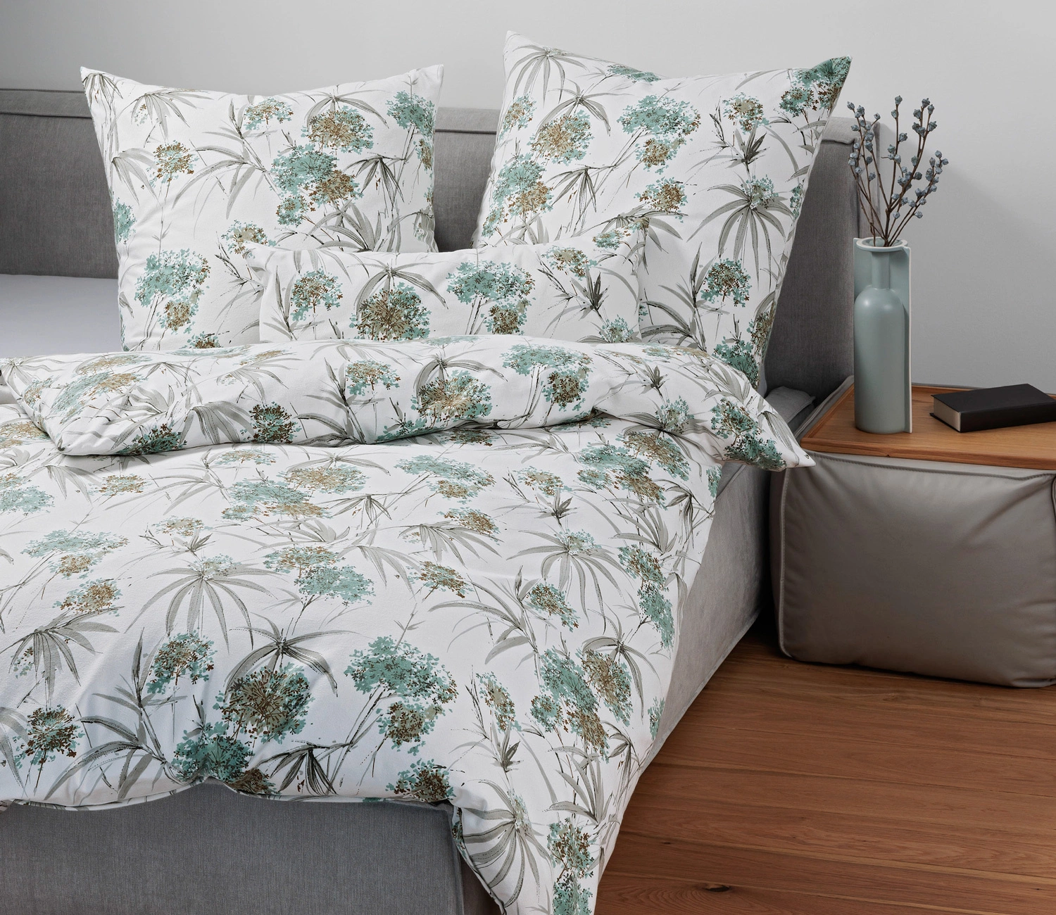 Pościel flanelowa Chinchilla S 78066-06 marki Janine. Nowoczesny, roślinny design w zielonej tonacji na białym tle. Wykonana z wysokiej jakości flaneli, ze 100% bawełny - miękkiej i przytulnej, która jest przyjemnie ciepła i reguluje temperaturę. Idealna na jesienno-zimową porę roku. Łatwa w pielęgnacji, zapinana na zamek błyskawiczny. Nie wymaga prasowania.