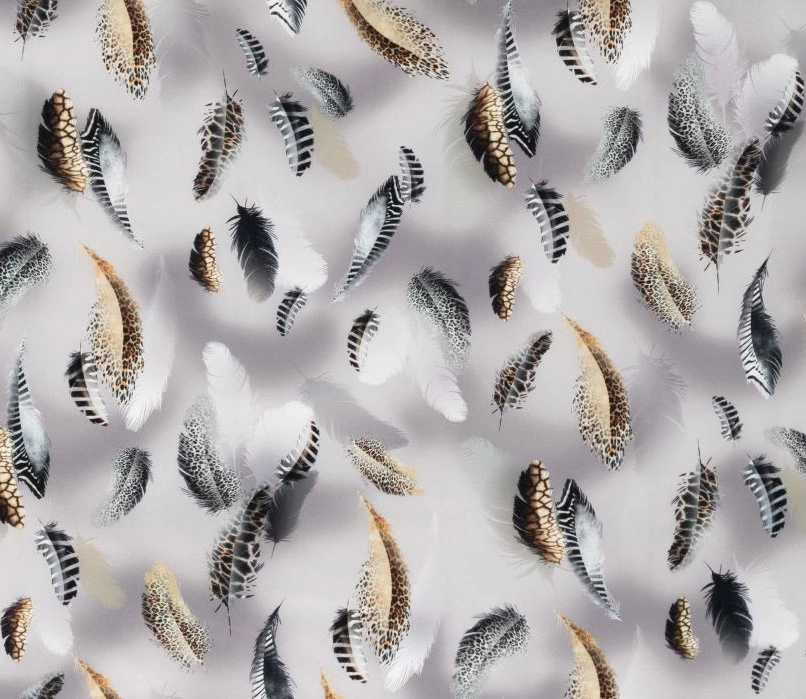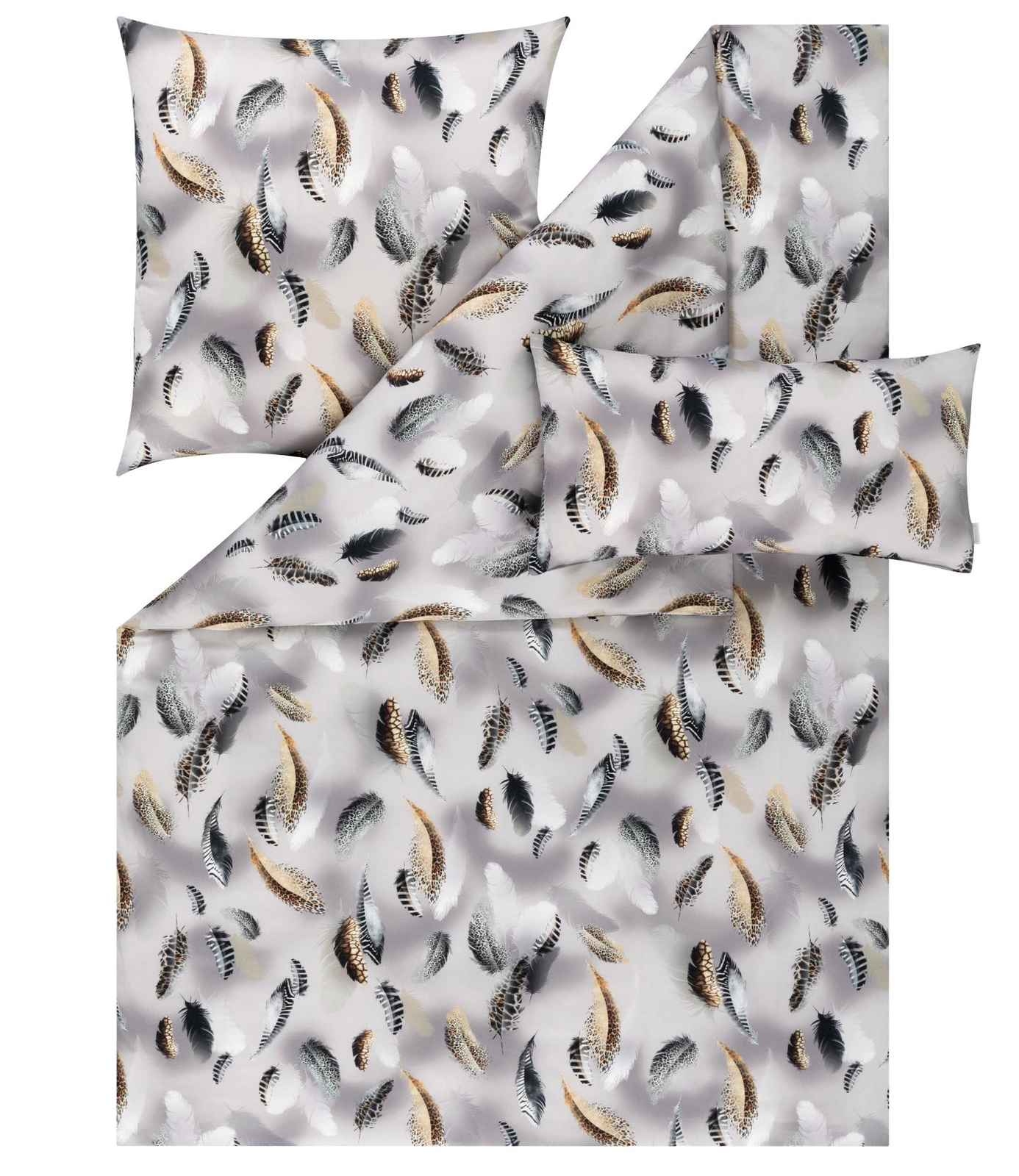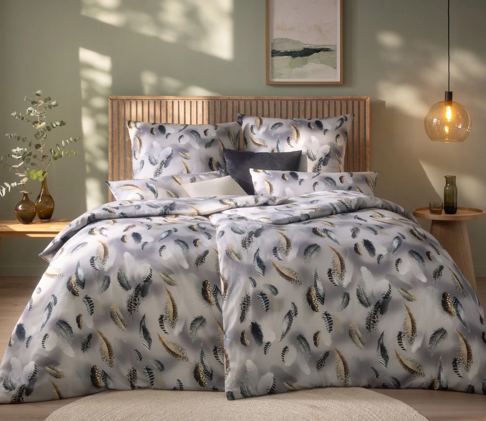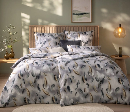 Pościel Bernadette 1034-810 to odważne zwierzęce printy połączone z delikatnością motywu piór. Tło szare.