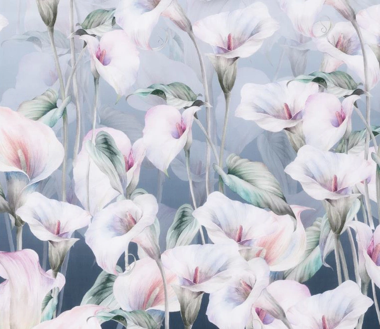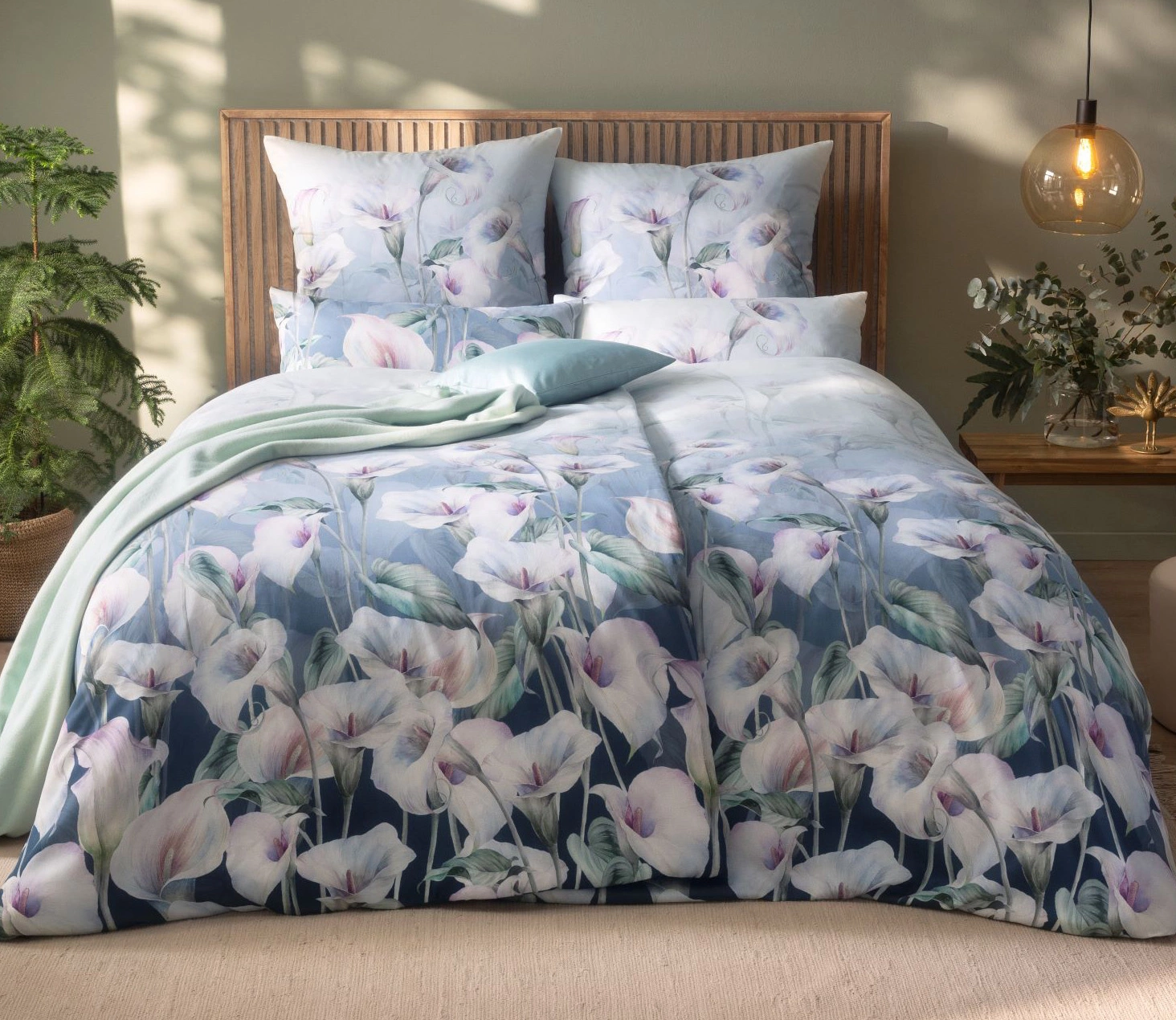 Pościel z satyny jedwabnej Carolin 1036-655 w duży motyw kwiatowy. Biało-różowe kalie na tle granatowym, przechodzącym w biel.