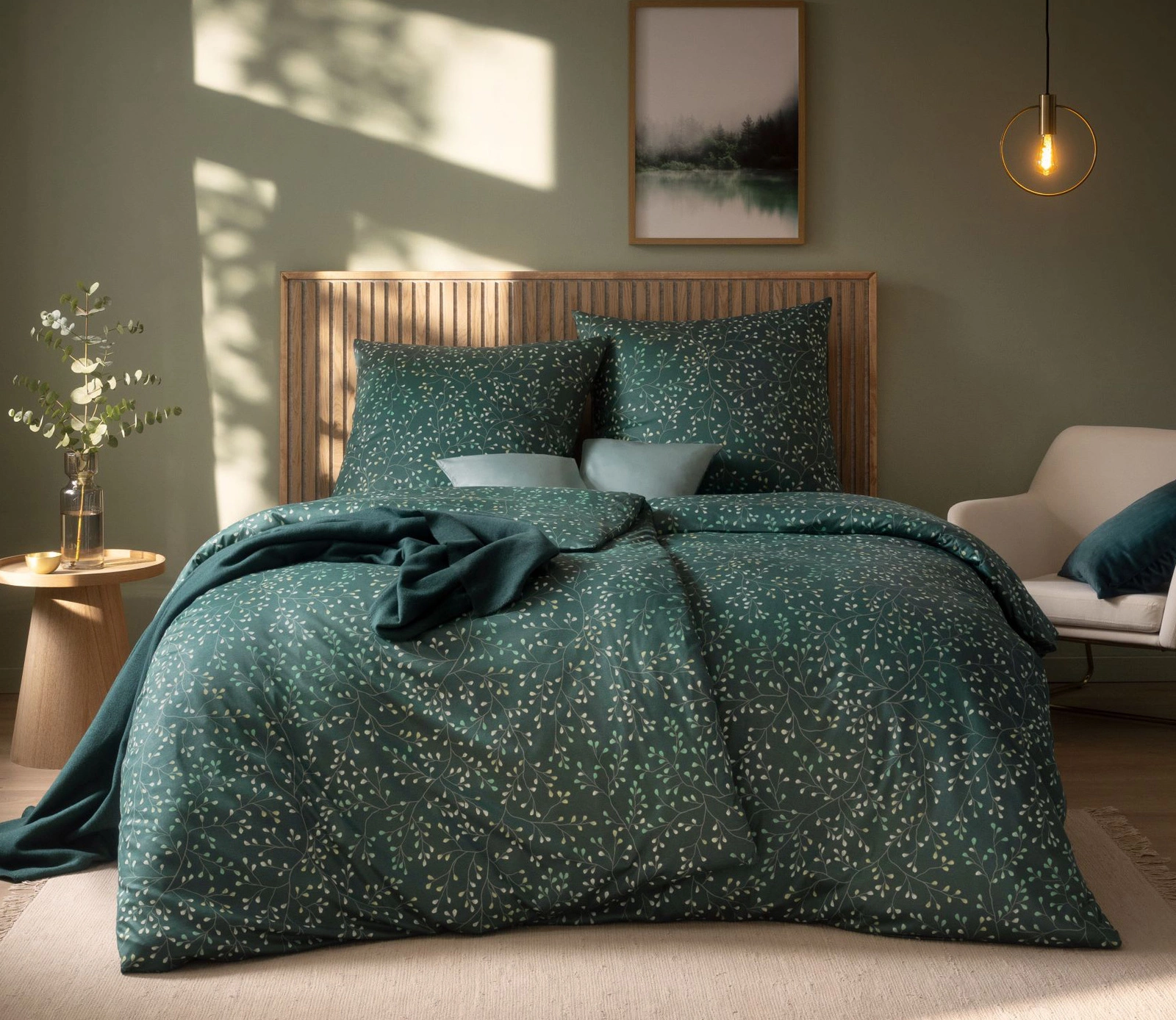 Pościel Aline 6391-581 przyciąga uwagę subtelnym motywem gałęzi i liści, które wpasowują się neutralne odcienie a ciemnozielone tło dodaje eleganckiej głębi.