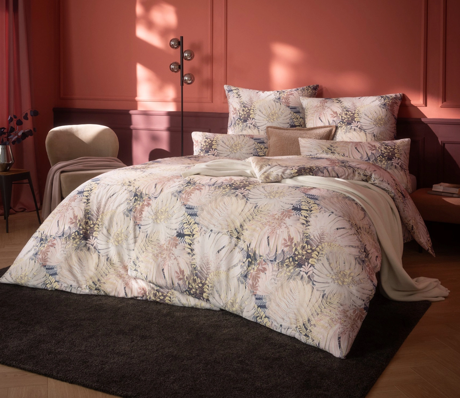 Pościel satynowa Amira to elegancka kompozycja inspirowana naturą, w której delikatne kwiaty w odcieniach różu, bieli, żółci i nude subtelnie rozkwitają na jasnym tle. Całość uzupełniają głębokie, granatowe detale, dodając wzorowi wyrafinowanego kontrastu. Lekka i zmysłowa, doskonale sprawdzi się w sypialni, gdzie liczy się zarówno przytulność, jak i stylowa oprawa.
