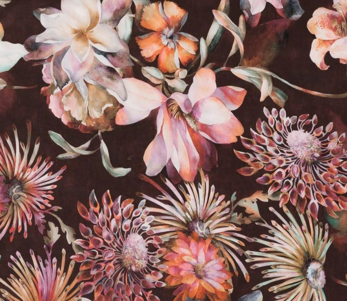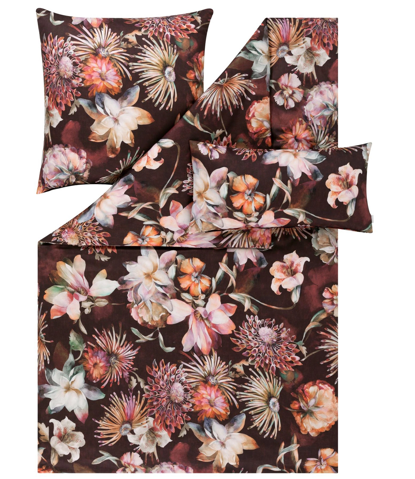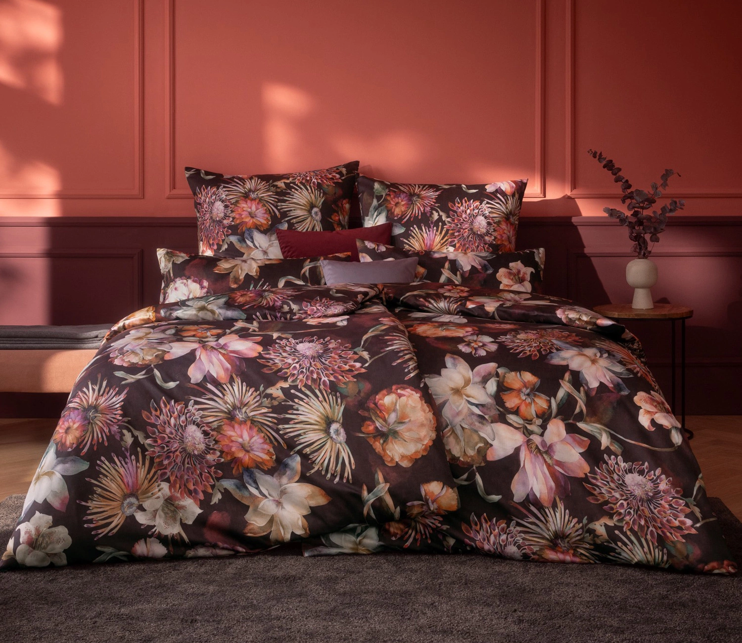 Pościel z satyny bawełnianej Jette w odcieniu głębokiego wina to kwintesencja elegancji z artystycznym zacięciem. Na tle nasyconej czerwieni rozkwita efektowna kompozycja kwiatów w barwach fioletu, moreli, kremu i stonowanego różu. Ten wyrazisty, malarski motyw dodaje wnętrzu zmysłowego uroku i odrobiny luksusu – idealny wybór dla osób ceniących oryginalny styl w sypialni.