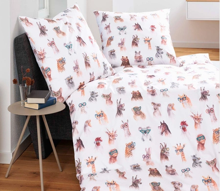 Pościel Modern Art S 42153-09 marki Janine. Na białym tle różne zabawne zwierzęta w okularach przeciwsłonecznych. Wykonana ze 100% satyny bawełnianej. Dzięki merceryzacji pościel zachwyca subtelnym połyskiem. Łatwa w pielęgnacji, zapinana na zamek błyskawiczny. Lekka i przyjemna w dotyku.