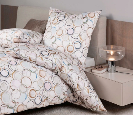 Pościel Modern Art S 42155-09 marki Janine. Nowoczesny wzór w kolorowe, nachodzące na siebie kręgi na jasnym tle. Wykonana ze 100% satyny bawełnianej. Dzięki merceryzacji pościel zachwyca subtelnym połyskiem. Łatwa w pielęgnacji, zapinana na zamek błyskawiczny. Lekka i przyjemna w dotyku.