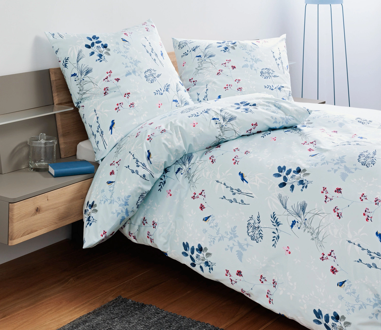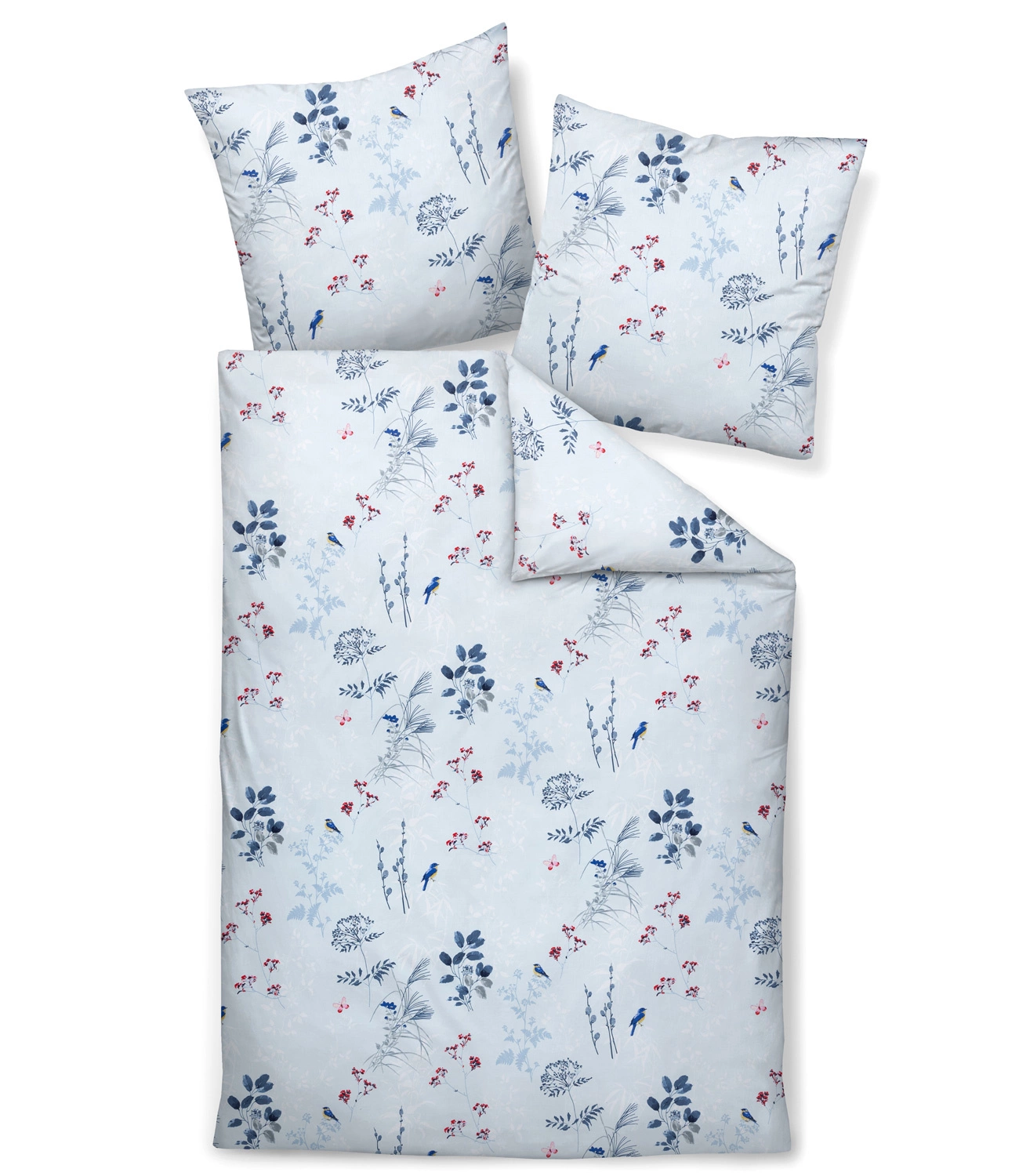 Pościel Moments 98126-02 marki Janine. Wzór w delikatne, niebieskie kwiaty na błękitnym tle. Wykonana z satyny bawełnianej ze 100% bawełny mako. Dzięki procesowi merceryzacji pościel zachwyca subtelnym połyskiem. Łatwa w pielęgnacji, zapinana na zamek błyskawiczny. Lekka i przyjemna w dotyku.