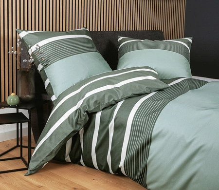Pościel  JD 8468-06 marki Janine. Wzór w pasy o różnej szerokości w odcieniach zieleni oraz bieli. Wykonana z satyny bawełnianej ze 100% bawełny mako. Dzięki procesowi merceryzacji pościel zachwyca subtelnym połyskiem. Łatwa w pielęgnacji, zapinana na zamek błyskawiczny. Lekka i przyjemna w dotyku.