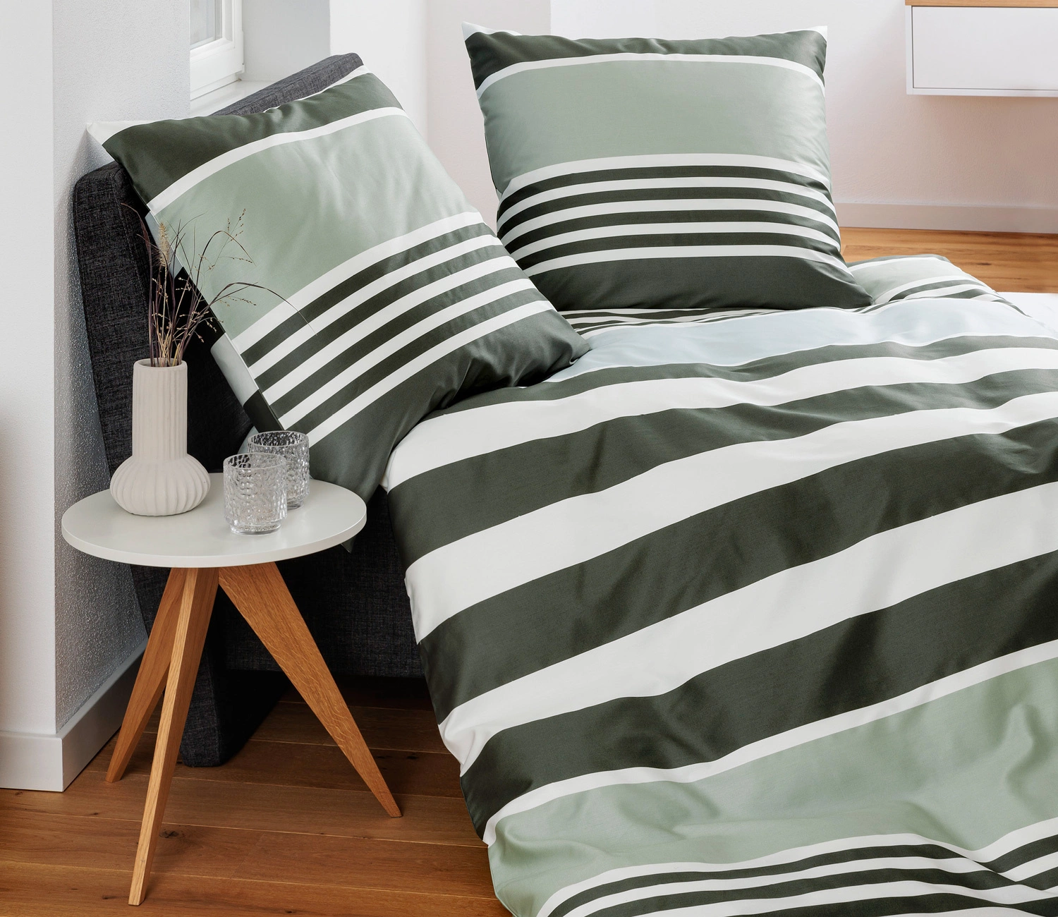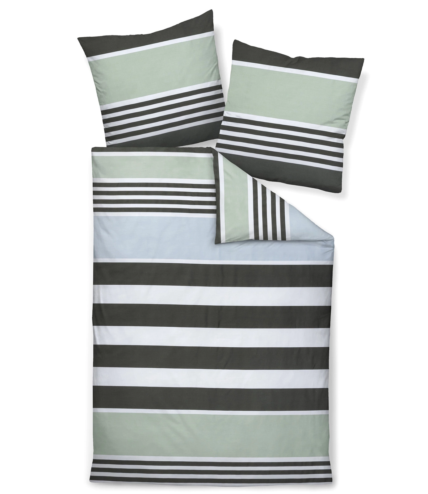 Pościel JD 87108-06 marki Janine. Wzór w pasy o różnej szerokości w odcieniach zieleni oraz bieli. Wykonana z satyny bawełnianej ze 100% bawełny mako. Dzięki procesowi merceryzacji pościel zachwyca subtelnym połyskiem. Łatwa w pielęgnacji, zapinana na zamek błyskawiczny. Lekka i przyjemna w dotyku.