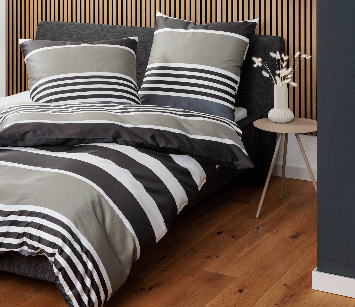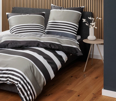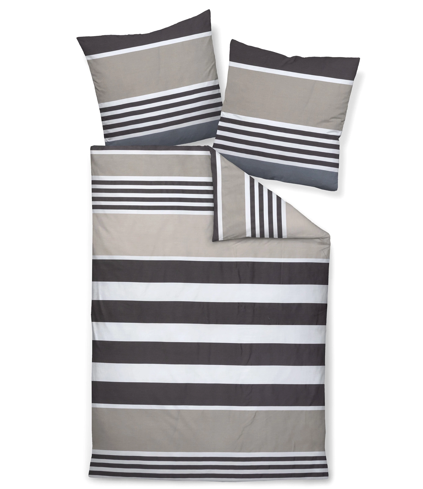 Pościel JD 87108-07 marki Janine. Wzór w pasy o różnej szerokości w kolorach brązu, szarości i bieli. Wykonana z satyny bawełnianej ze 100% bawełny mako. Dzięki procesowi merceryzacji pościel zachwyca subtelnym połyskiem. Łatwa w pielęgnacji, zapinana na zamek błyskawiczny. Lekka i przyjemna w dotyku.