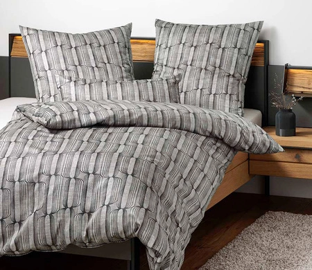 Pościel jersey Carmen S 55121-08 marki Janine. Nowoczesny, graficzny wzór w drobne linie splatające się w regularnych odstępach. Tło szare. Wykonana z miękkiej, elastycznej tkaniny, która wyróżnia się techniką podwójnego splotu. Charakteryzuje się wyjątkową gładkością i chłonnością, nie wymaga prasowania. Materiał ten jest bardzo lekki – 100 metrów tej szlachetnej przędzy waży zaledwie 1 gram. Szlachetne naturalne włókno bawełniane sprawia, że wysokiej jakości pościel jerseyowa jest szczególnie oddychająca i reguluje wilgoć, co czyni ją idealną do użytku przez cały rok. Łatwa w pielęgnacji, zapinana na zamek błyskawiczny.