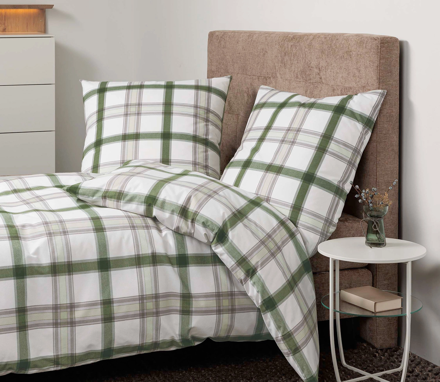 Pościel flanelowa Cortina 71002-06 marki Janine. Wzór w kratę o subtelnie zacienionych odcieniach szarości i zieleni, tło jasne. Aksamitna jak flanela ale znacznie lżejsza. Materiał wykonany w 100% z bawełny zachwyca szczególnie miękką powierzchnią i przyjemną lekkością. Tkanina wysokiej jakości jest oddychająca i regulująca wilgoć, a zatem świetna jakość przez cały rok. Łatwa w pielęgnacji, zapinana na zamek błyskawiczny. Nie wymaga prasowania.