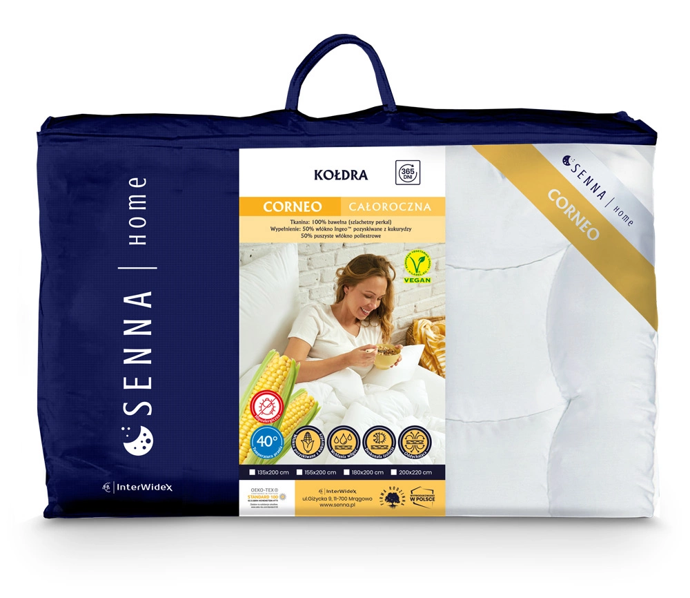 Senna Corneo to nowoczesna, przyjazna środowisku całoroczna kołdra, która łączy skuteczną termoizolację z wysokim komfortem użytkowania. Jej wypełnienie wykonano z innowacyjnych włókien Ingeo™, pozyskiwanych z odnawialnych źródeł – naturalnej skrobi kukurydzianej.