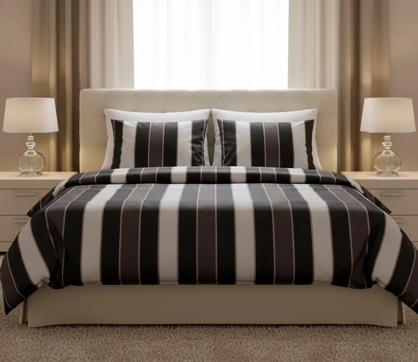 Pościel w kolorze czarno-szarym, wzór w różnorodne szerokie pasy. Ten klasyczny, orientalny motyw w nowoczesnym wydaniu nadaje całości niezwykłej klasy i artystycznego wyrazu, tworząc efekt pełen pasji i elegancji.
