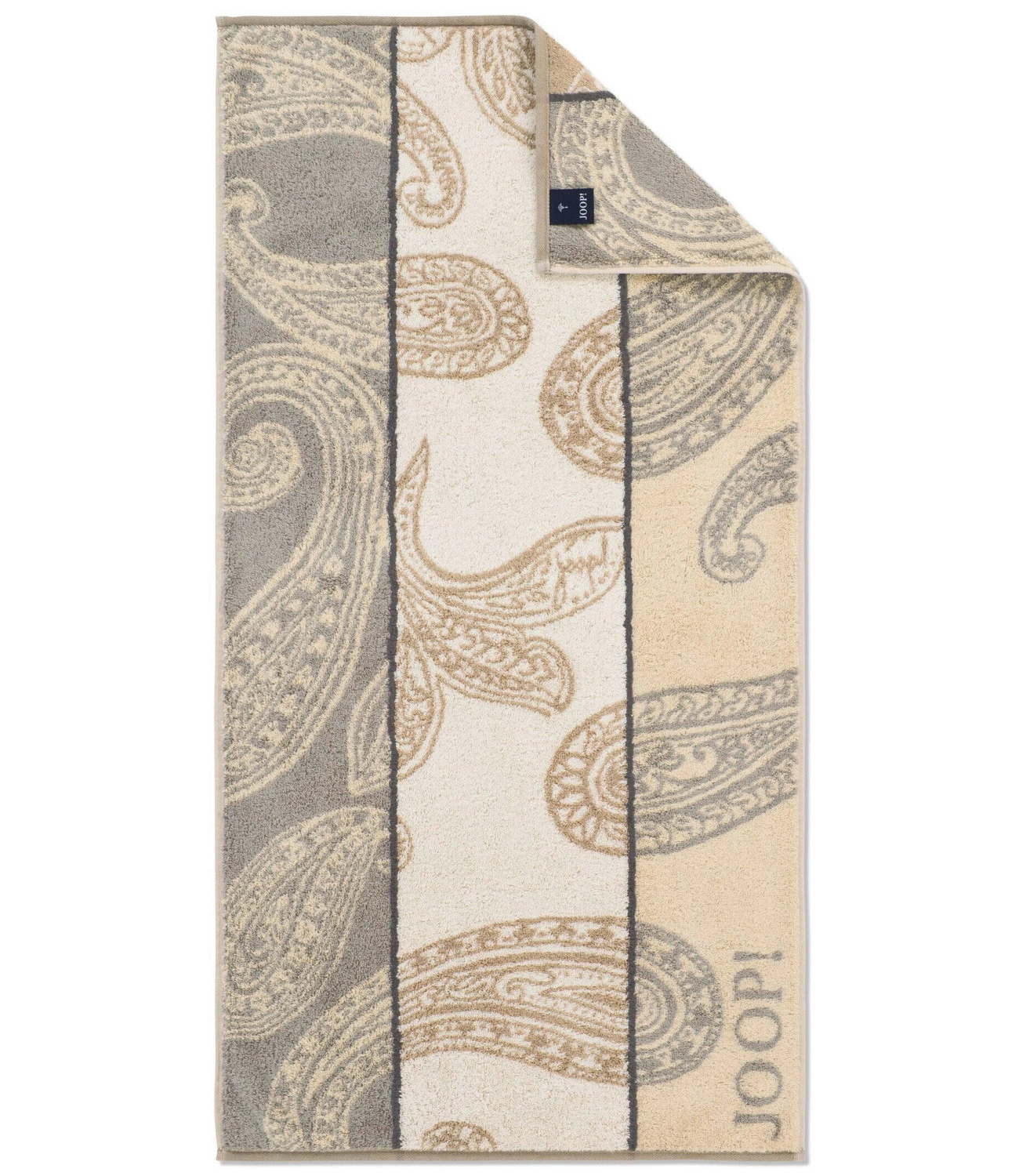 Ręcznik wyróżnia się ponadczasowym, orientalnym wzorem paisley, który został przedstawiony w niezwykle gustownym wydaniu. Projekt opiera się na harmonijnym połączeniu trzech pasów kolorystycznych – chłodnej szarości, ciepłego piaskowego beżu oraz delikatnej, złamanej bieli. Ta spokojna i uniwersalna kompozycja tworzy niezwykle stylowy efekt, który wnosi do wnętrza spokój i klasę. Całość dopełnia elegancko wplecione logo JOOP!, będące symbolem autentyczności i nienagannej jakości.