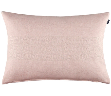 Poszewka ma różowy odcień melanżu, który doskonale harmonizuje z nowoczesnymi i minimalistycznymi wnętrzami w stylu quiet luxury. Jej unikalność tkwi w subtelnym, żakardowym wzorze Signature Stripes – geometryczne motywy (ikoniczne kółka JOOP!) są wkomponowane w poziomy pas, tworząc delikatnie uwypuklony (reliefowy) efekt. Ten efekt 3D sprawia, że poszewka przyciąga wzrok i nadaje jej luksusowej głębi.