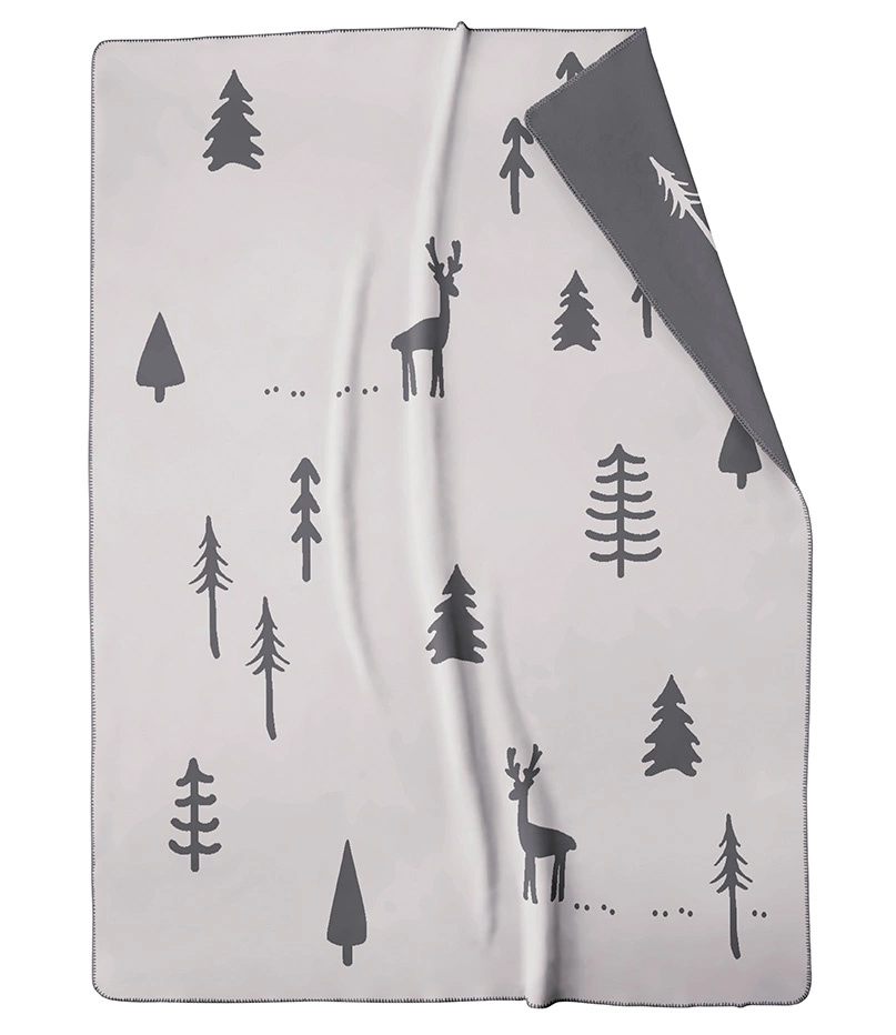 Koc jest w pełni dwustronny – z jednej strony dominuje jasny, ciepły kolor tła, a z drugiej strony kolorystyka jest odwrócona (negatyw), co daje możliwość szybkiej zmiany aranżacji. Wzór przedstawiający leśną zwierzynę, i zimowe drzewa tworzy elegancki, alpejski motyw, idealny do stworzenia atmosfery hygge.
