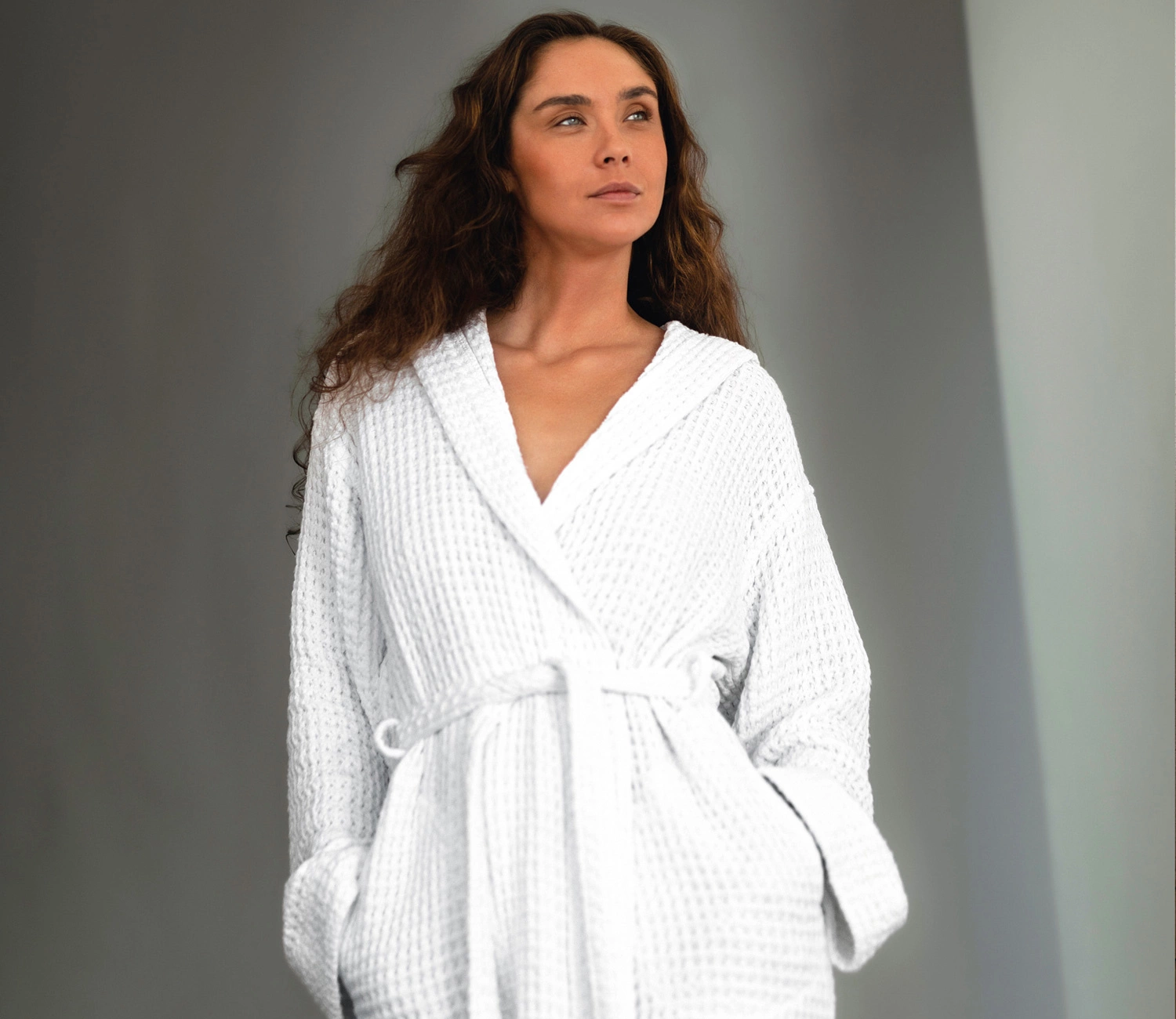 Szlafrok Graccioza Aura to model stworzony dla osób, które pragną połączyć codzienny komfort z luksusem premium. Wykonany w 100% z wysokiej jakości bawełny, zachwyca miękkością, chłonnością i przyjemną, delikatnie fakturowaną strukturą waffle. To szlafrok, który otula jak miękka chmura już od pierwszego założenia, przynosząc ukojenie po kąpieli lub wieczornym rytuale pielęgnacyjnym.