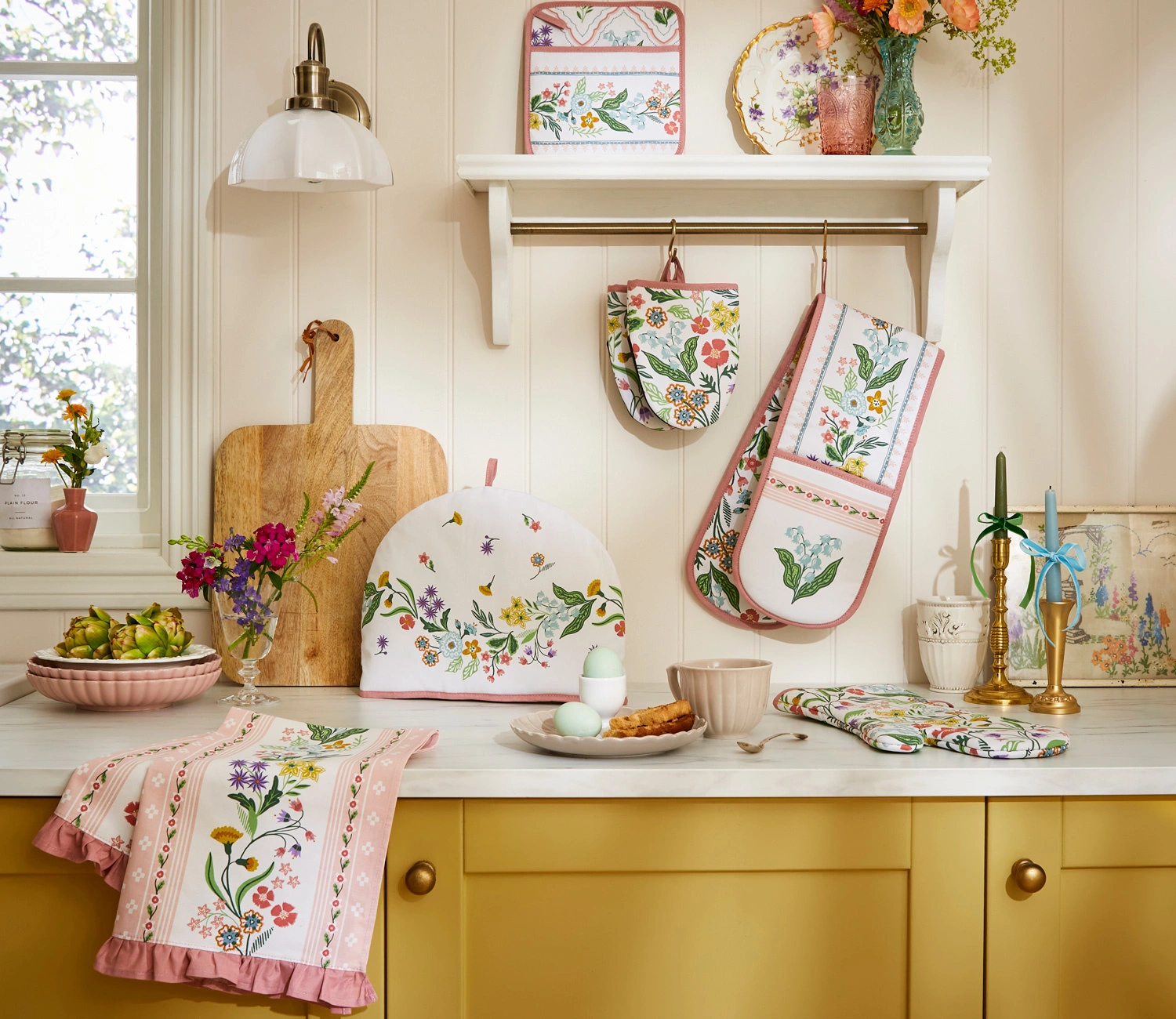 Rękawica kuchenna Petals & Prose to połączenie romantycznej estetyki epoki regencji z nowoczesną funkcjonalnością. Wzór opiera się na motywach polnych kwiatów, kwiatowych pergoli oraz drobnych nadruków typu. Pastelowa kolorystyka i detale nadają jej elegancki, kobiecy charakter.