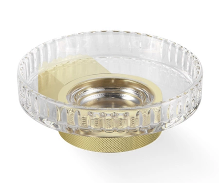 Naścienna mydelniczka CLUB STS marki Decor Walther z kolekcji CLUB. Okrągła forma, kryształ szlifowany, ozdobny pierścień i uchwyt mocujący do ściany wykonany z mosiądzu pokryty 24 karatowym złotem.