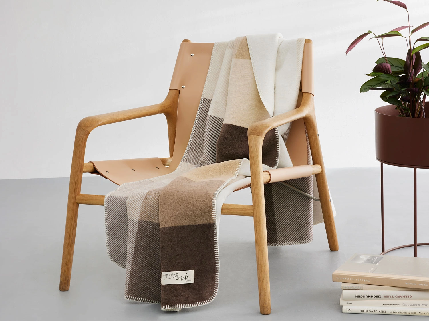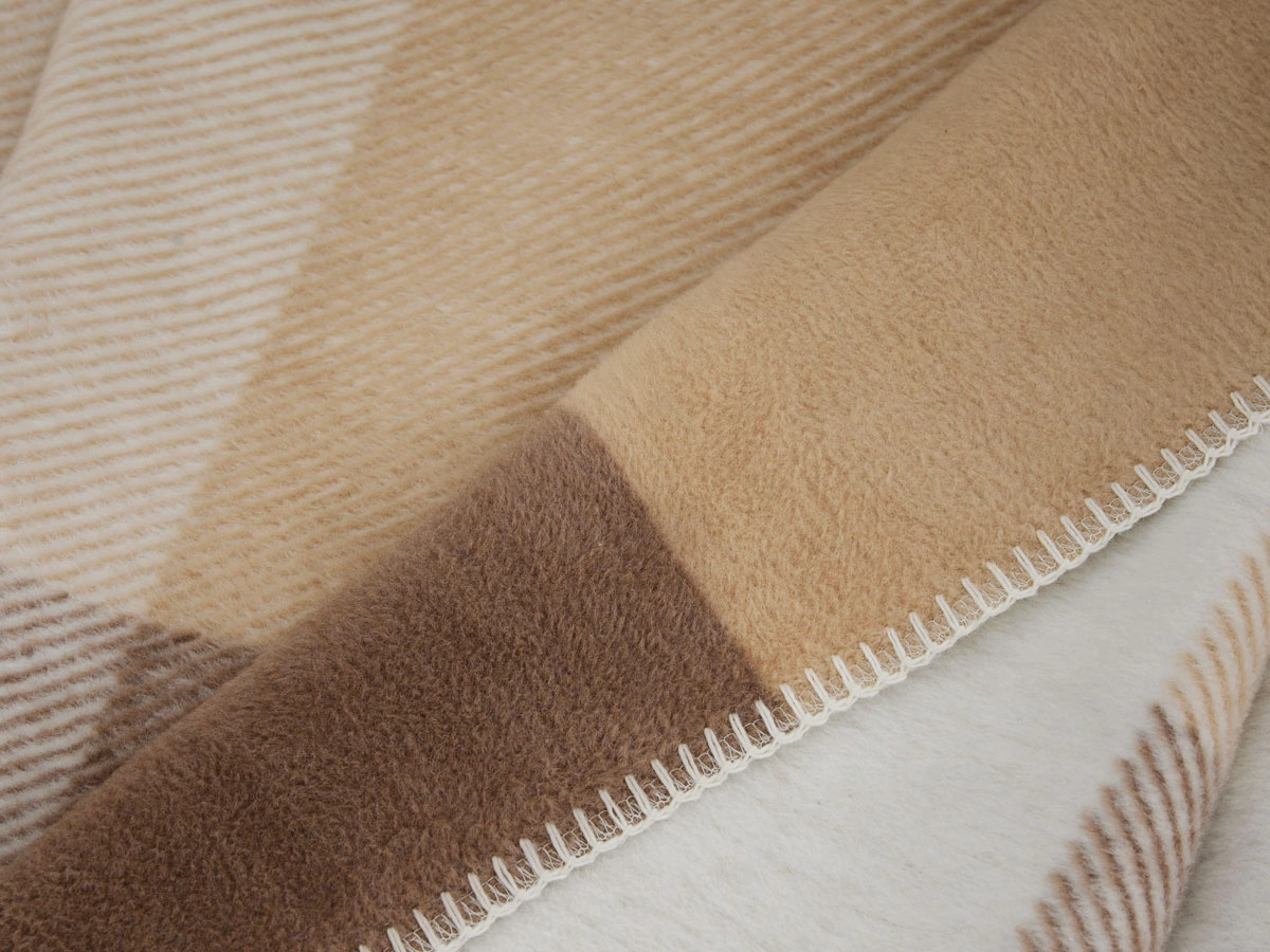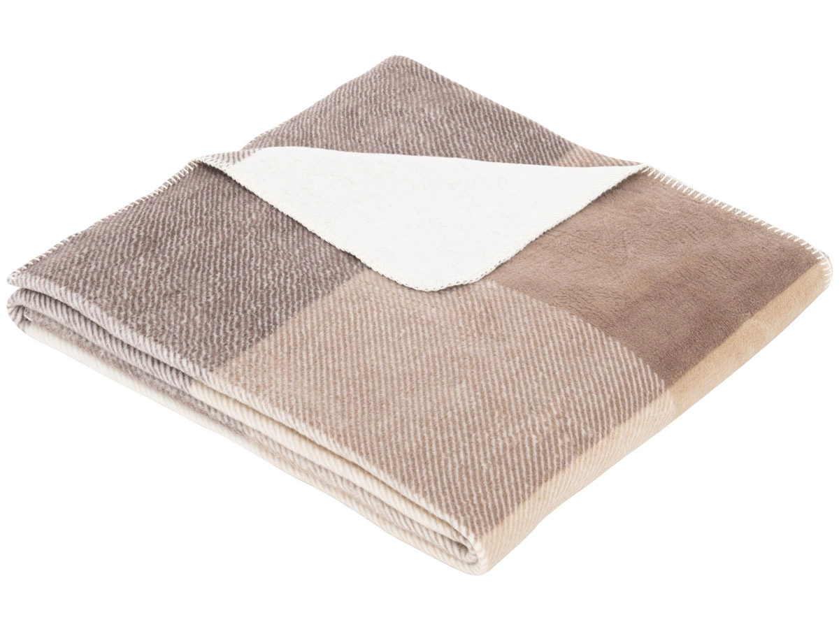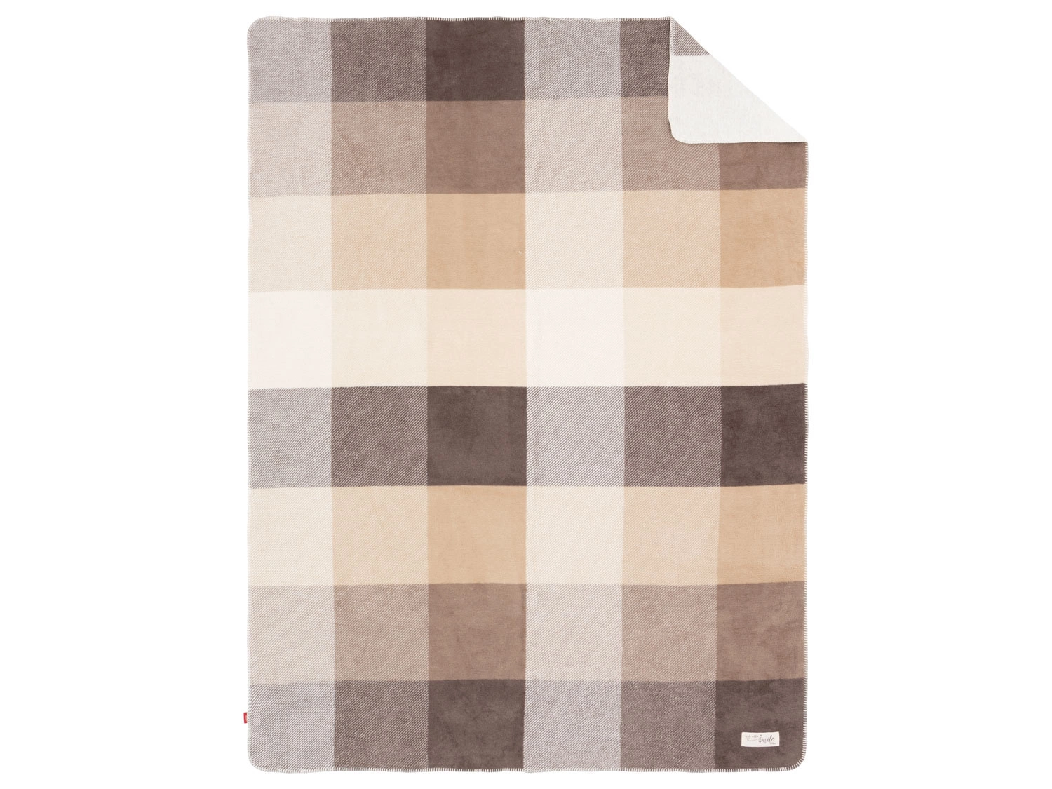 Żakardowy koc marki S.Oliver 1526-300. Nowoczesny wzór w dużą kratę w kolorach beżu, kremu i brązu, wykończony ściegiem dzierganym. Wykonany z bawełny i poliakrylu.