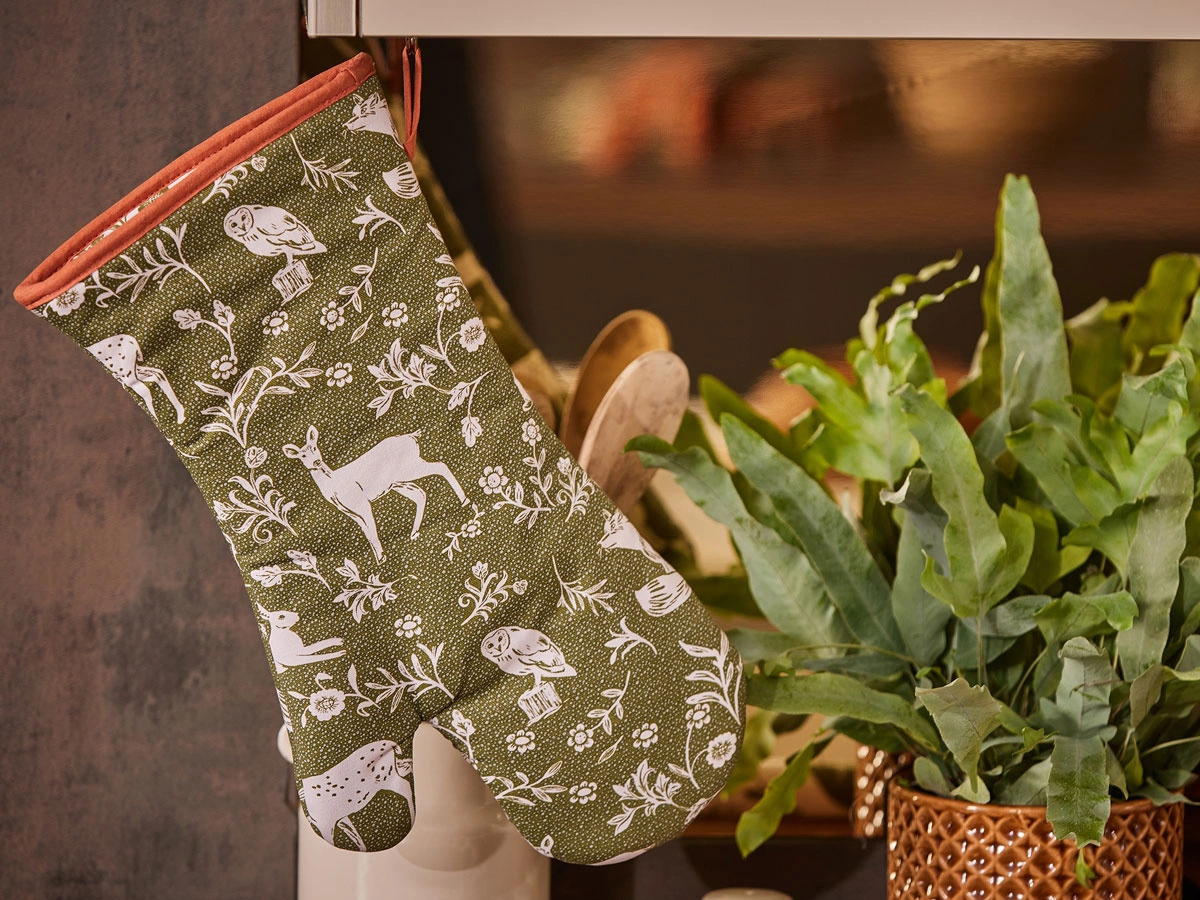Rękawica z kolekcji Forest Friends Sage marki Ulster Weavers. Stanowi ochronę dla dłoni przed gorącymi talerzami i tacami w kuchni. Wykonana w 100% z niebielonej bawełny z wypełnieniem poliestrowym. Posiada certyfikat CE.
