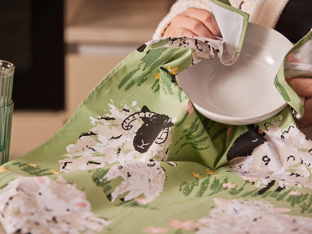 - Ściereczka kuchenna Woolly Sheep przedstawiająca owce na łące wykonana jest w 100% z bawełny i świetnie nadaje się do wycierania naczyń.