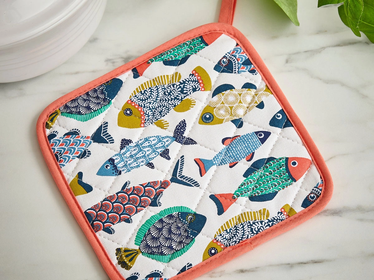 Łapka kuchenna Aquarium z motywem wielobarwnych ryb. Idealna do ochrony blatu przed gorącymi garnkami. Wykonana w 100% z bawełny z wypełnieniem poliestrowym.