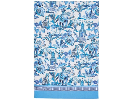 Ściereczka kuchenna Indian Blue w niebieskie słonie i tygrysy na tle dżungli. Wykonana jest w 100% z bawełny i świetnie nadaje się do wycierania naczyń.