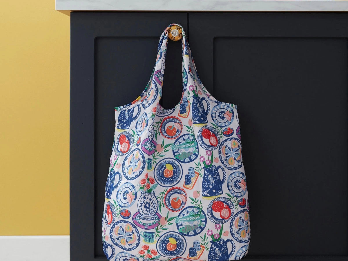 - Siatka na zakupy Mediterranean Plates marki Ulster Weavers w wielobarwne talerze i dzbanki.Dzięki łatwemu zwinięciu i zapięciu na guziki, może być przechowywana w torebce lub kieszeni.