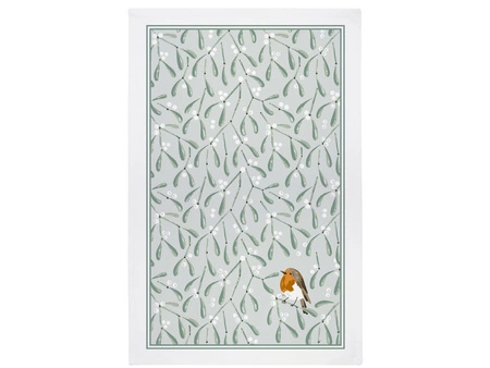 Ściereczka kuchenna Mistletoe & Robin z motywem rudzika na tle jemioły wykonana jest w 100% z bawełny, świetnie nadaje się do wycierania naczyń.