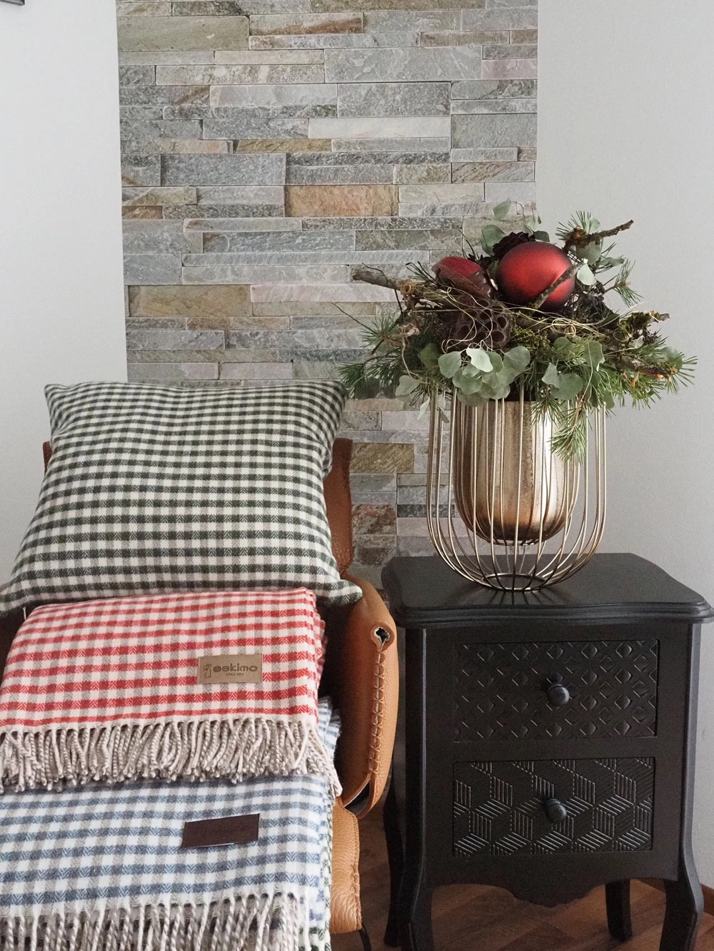 - Klasyczny koc w kratkę vichy, Maloja Beige marki Eskimo. Kolor beżowo-biały. Delikatne frędzle. Lekki i bardzo miły w dotyku. Wykonany z mieszanki wełny i poliamidu.
