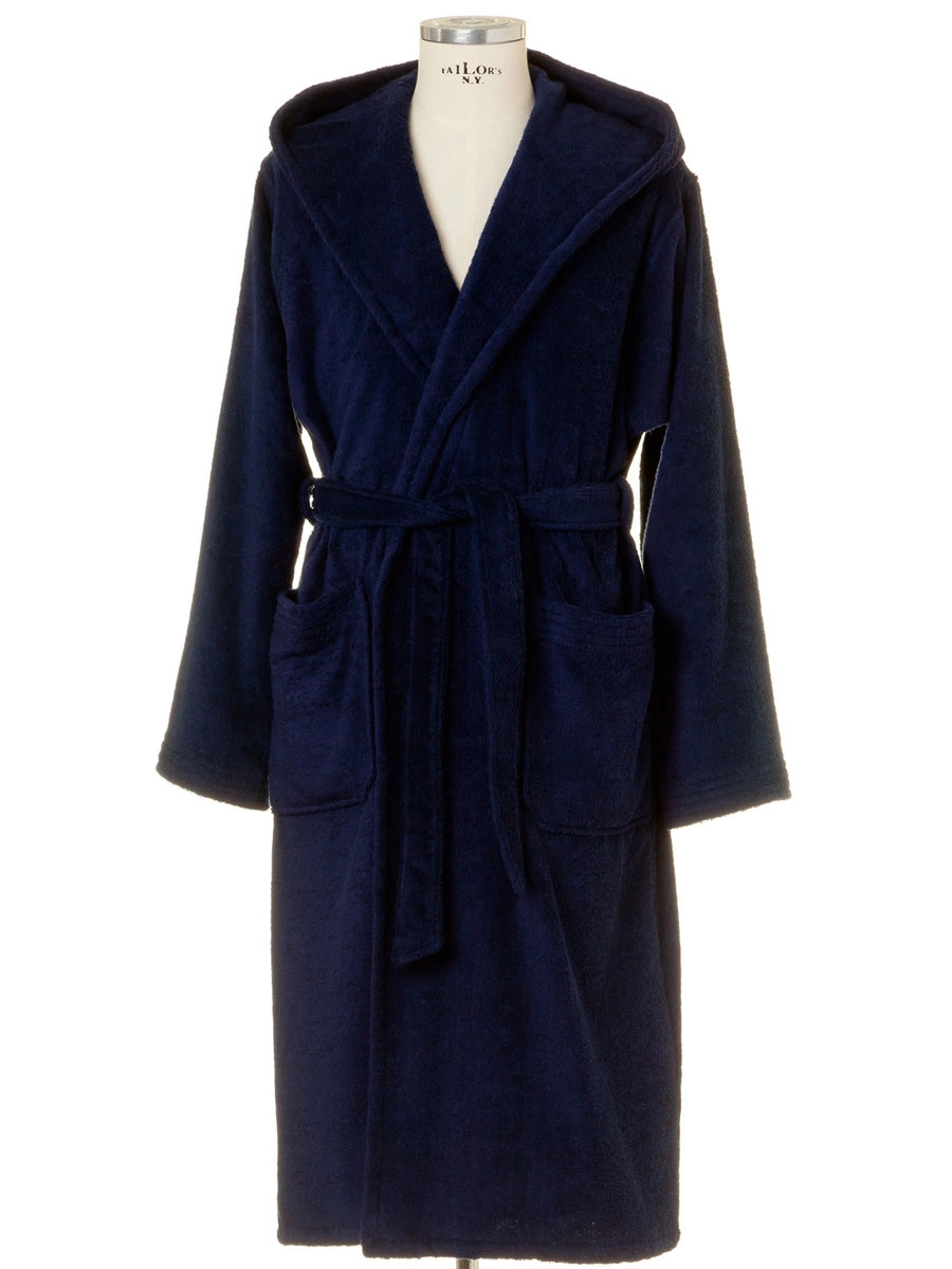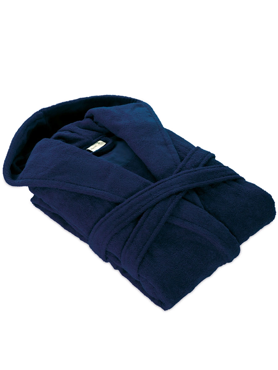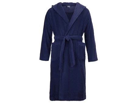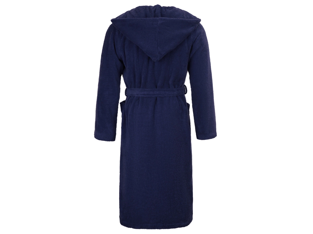 Gruby szlafrok z kapturem Superwuschel marki Möve. Kolor 596 deep sea, granatowy. Wykonany z najwyższej jakości bawełny o gramaturze 380 g/m2. Przewiązywany w talii taśmą. Dwie kieszenie z ozdobnymi lamówkami u góry. Długość 120 cm.