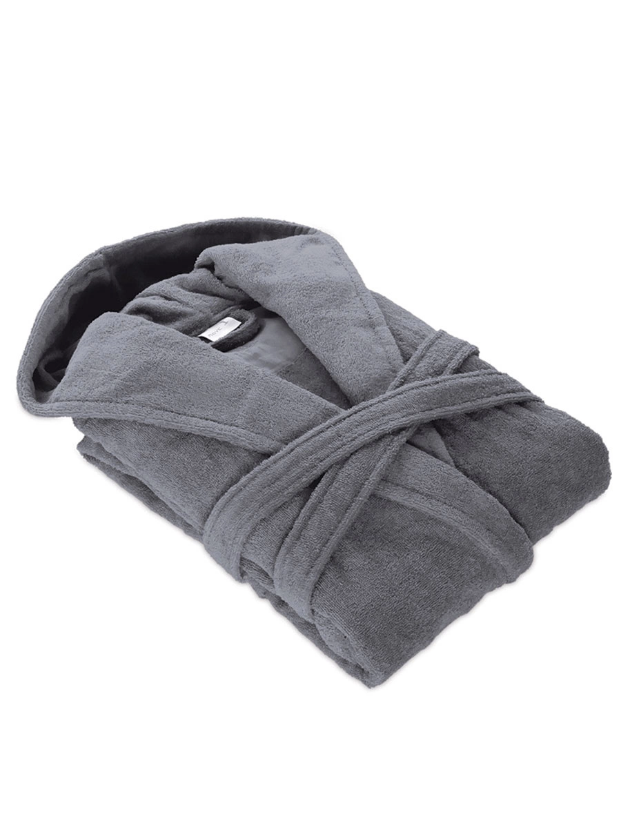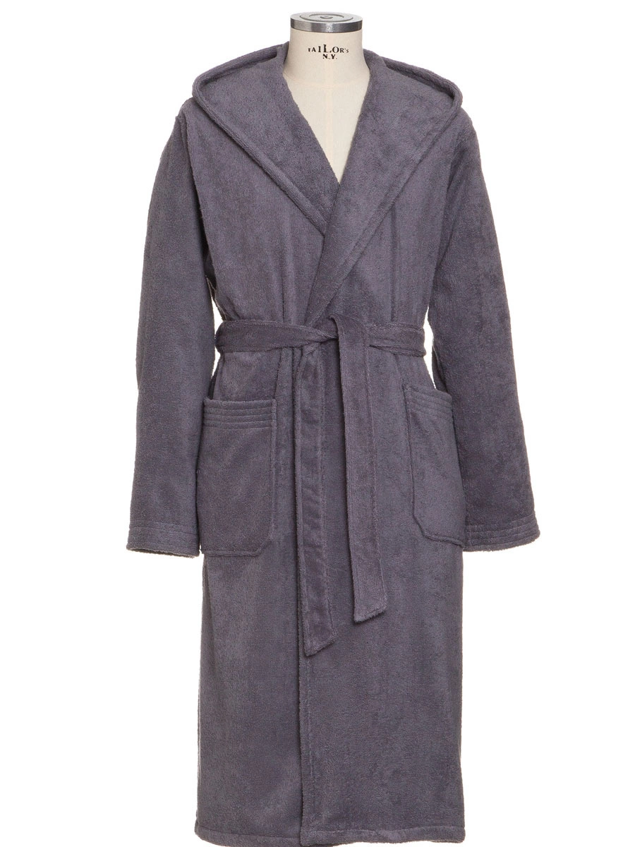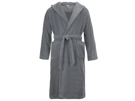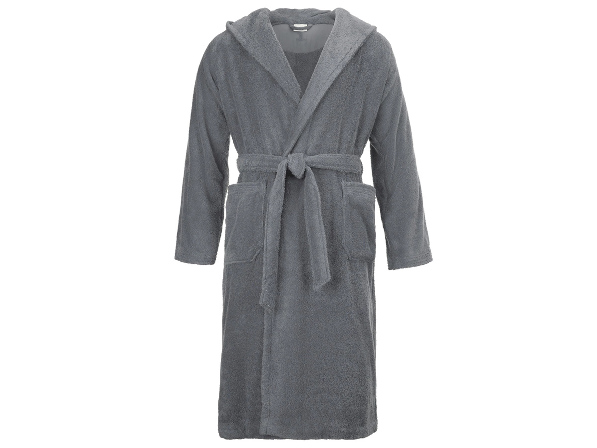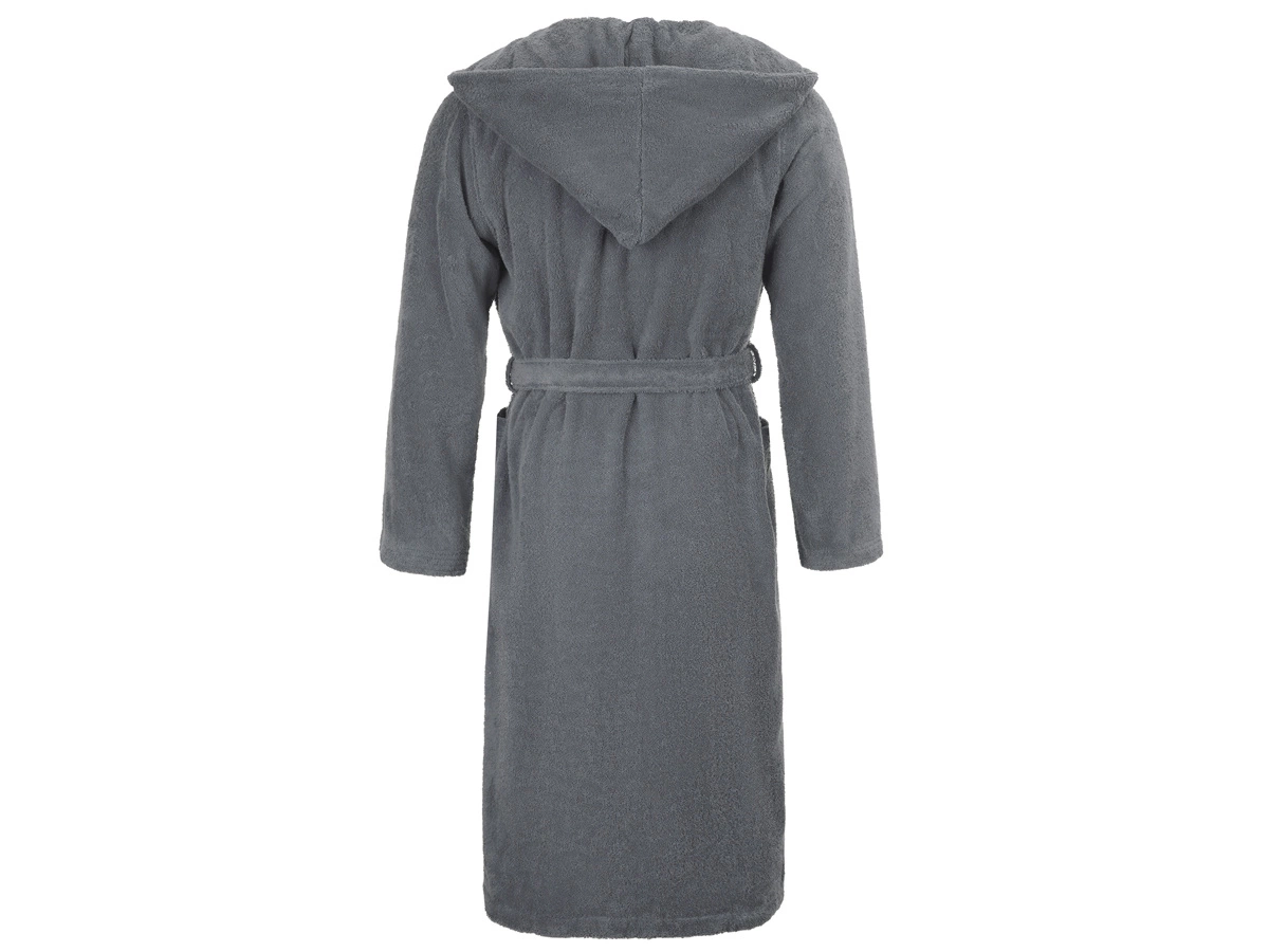 Gruby szlafrok z kapturem Superwuschel marki Möve. Kolor 850 stone, szary. Wykonany z najwyższej jakości bawełny o gramaturze 380 g/m2. Przewiązywany w talii taśmą. Dwie kieszenie z ozdobnymi lamówkami u góry. Długość 120 cm.