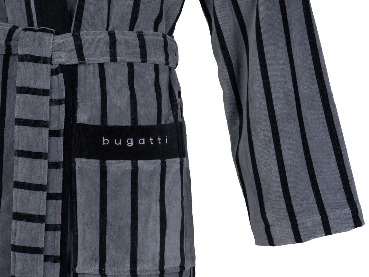 Welurowy szlafrok kimono Antonio marki bugatti. Eleganckie pasy, modna kolorystyka, czarne wykończenie kieszeni oraz brzegów. Wyjątkowo przyjemny materiał ze 100% bawełny.
