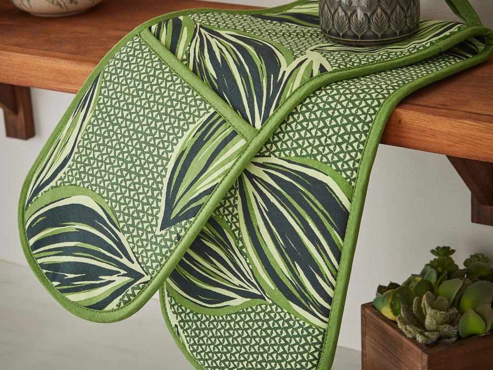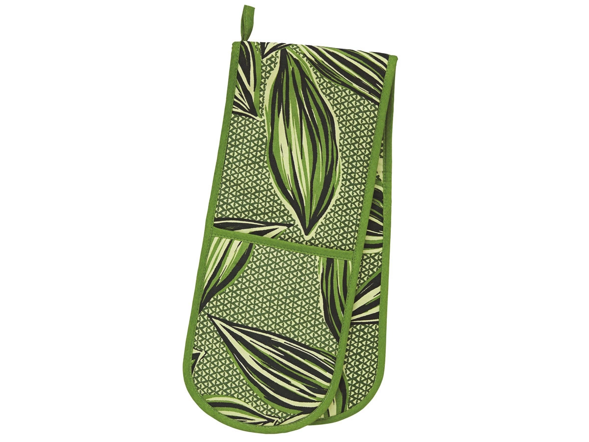 - Podwójna rękawica kuchenna z kolekcji Geo Leaves. Chroni dłonie przed gorącymi blachami. Wykonana w 100% z bawełny z wypełnieniem z poliestrowym dla ochrony.