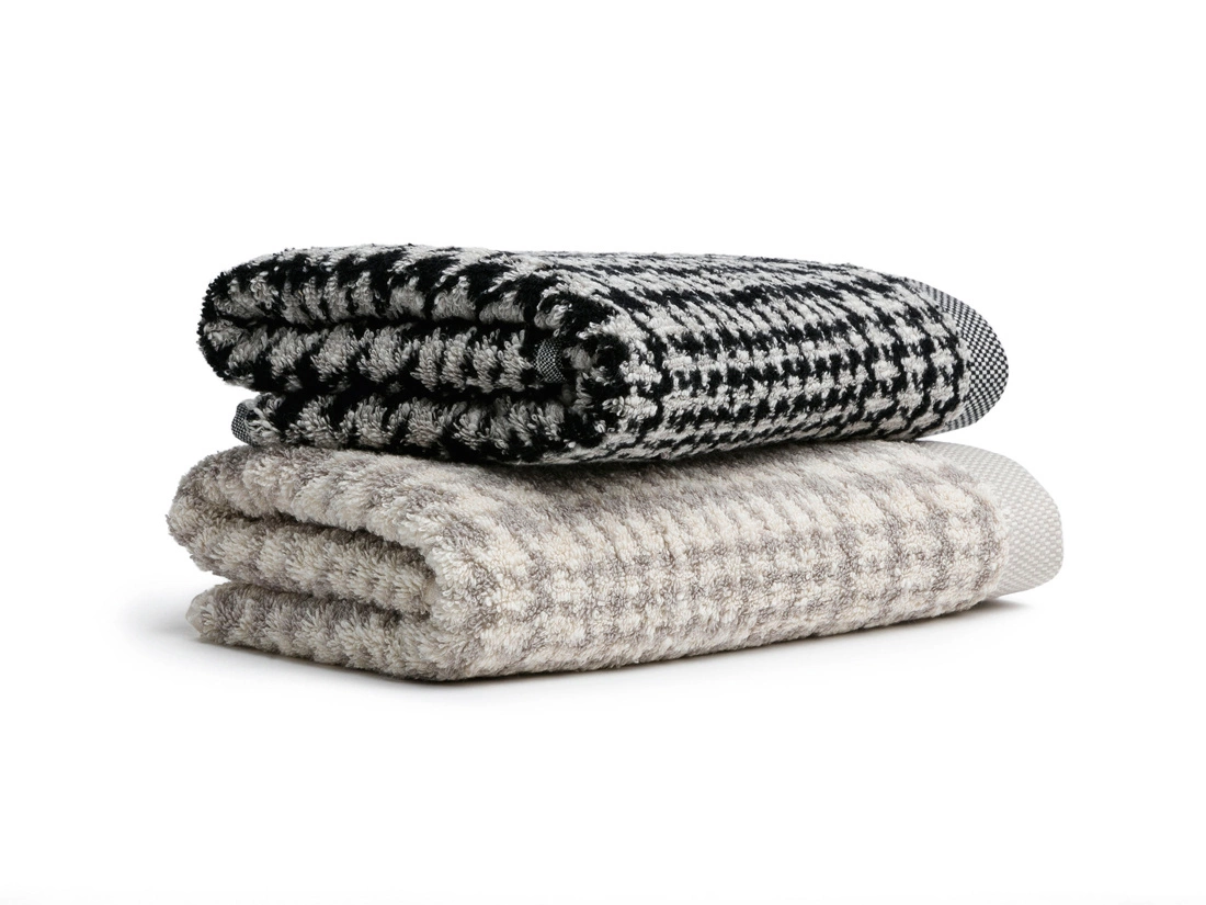 Ponadczasowa kolekcja ręczników Brooklyn Glenchech w kolorze beżowym. Ponadczasowy wzór glencheck, intrygująca struktura materiału - boucle połączona z ekskluzywnym połączeniem bawełny, wiskozy i lnu.